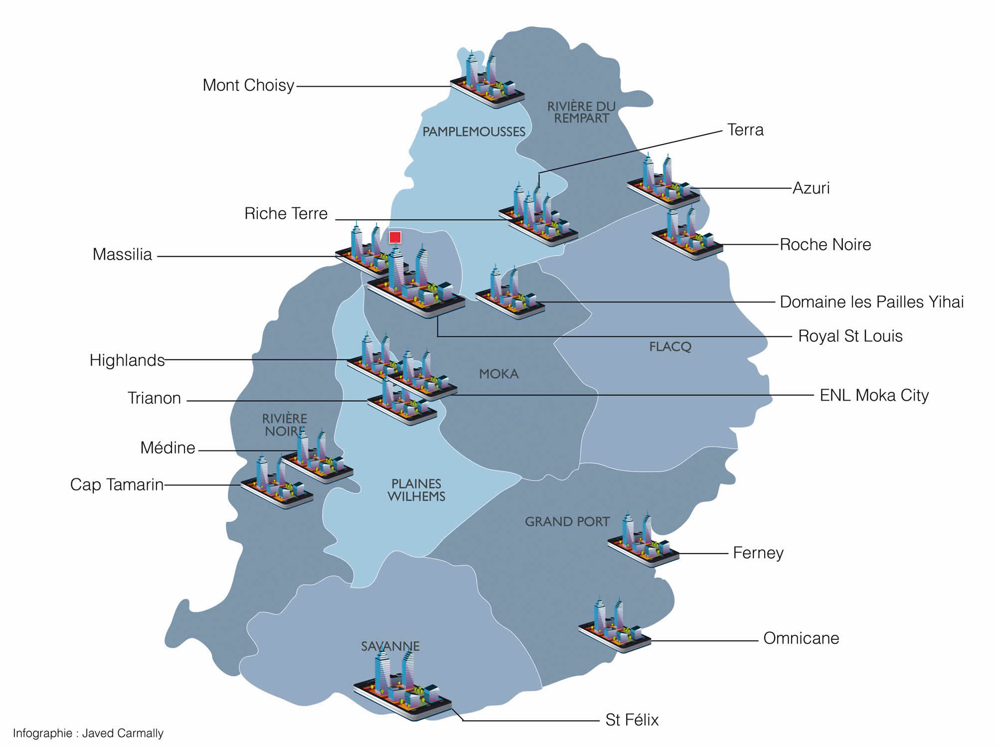 63 000 personnes y vivront et 56 000 y travailleront. Bagatelle Mall. Motor City et les Allées de Helvétia existent déjà depuis quelques temps. Ils feront désormais partie de la ville intelligente que le groupe ENL veut ériger.Le Parc de Mont-Choisy