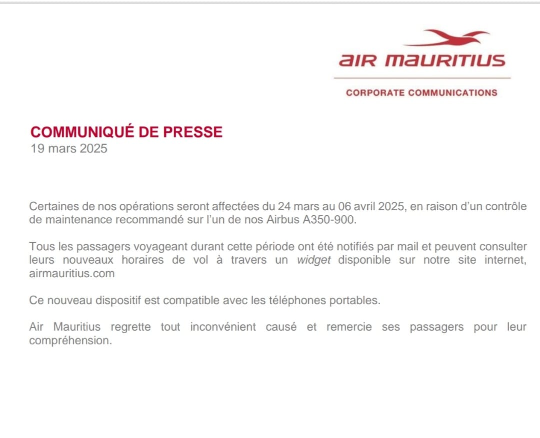 Certaines opérations d’Air Mauritius seront affectées du 24 mars au 6 avril 2025 en raison d’un contrôle de maintenance recommandé sur l’un de ses Airbus A350-900. Par conséquent, des vols seront reprogrammés. C’est ce qu’indique un communiqué de la compagnie d'aviation nationale publié ce mercredi 19 mars.