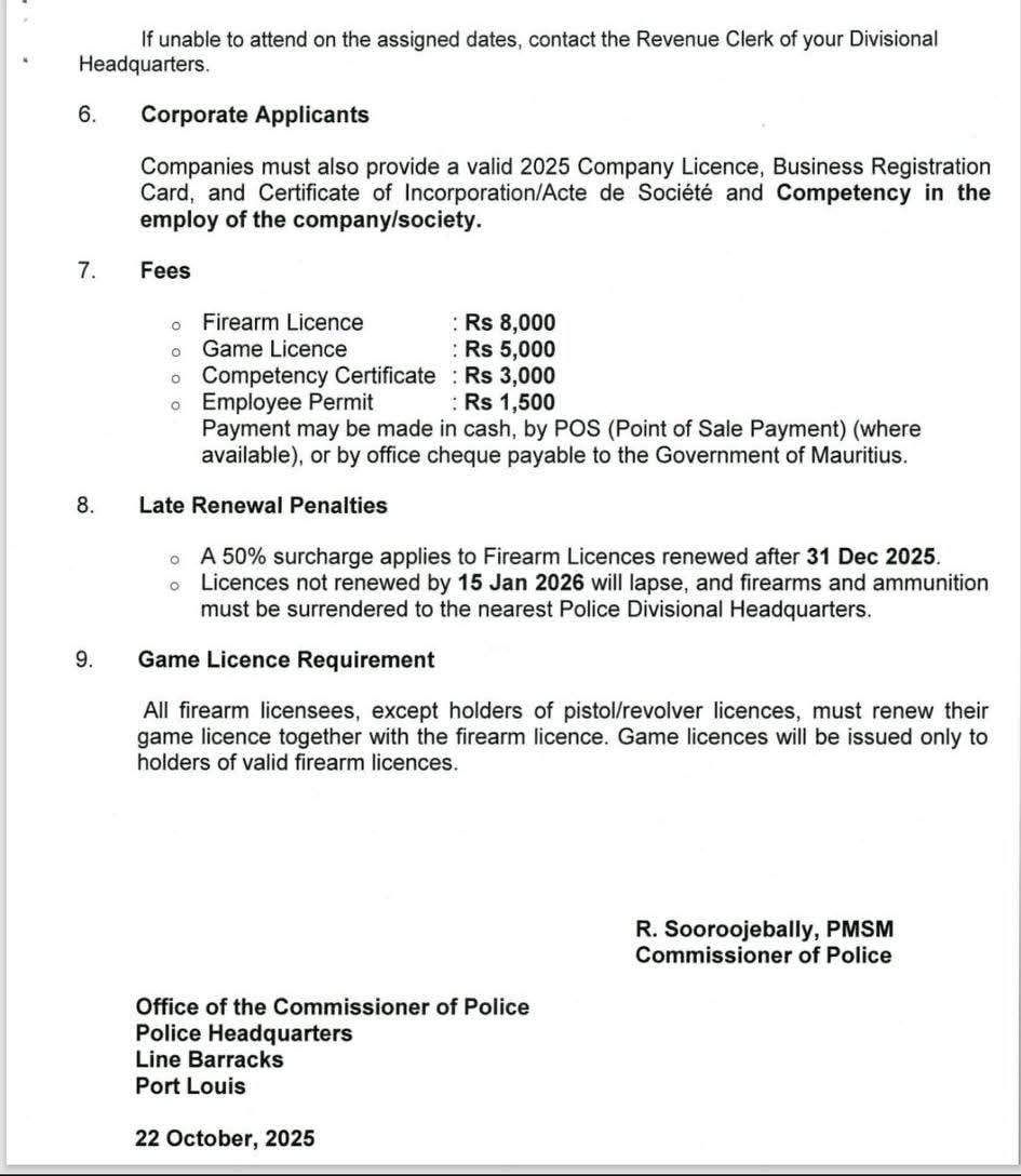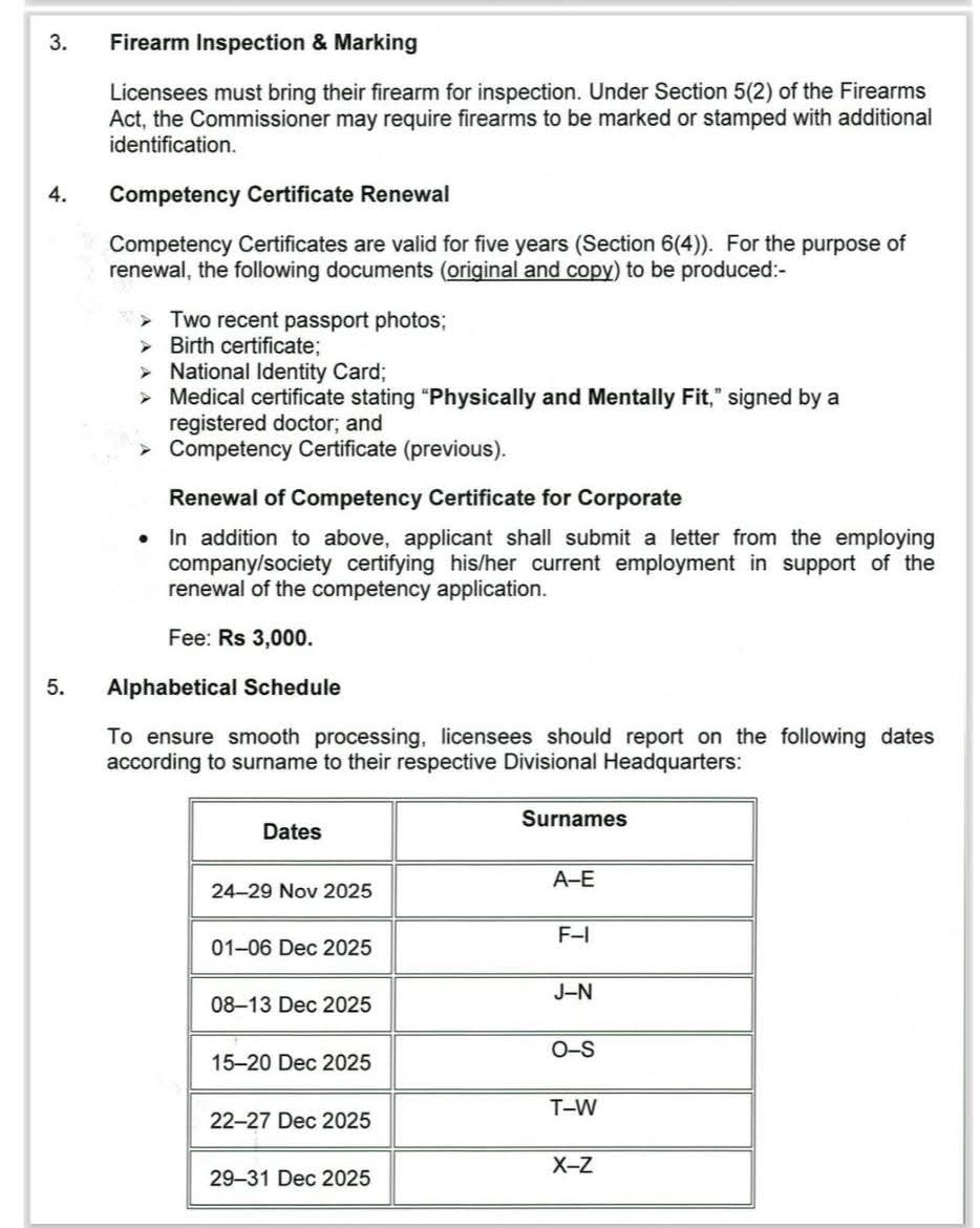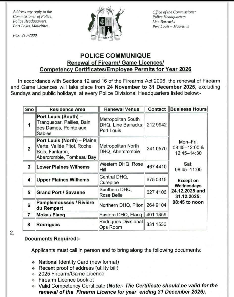 Le renouvellement des permis d’armes à feu ainsi que des certificats de compétence et permis d’employé pour l’année 2026 se tiendra du 24 novembre au 31 décembre 2025, à l’exception des dimanches et jours fériés. L’exercice se déroulera dans les Police Divisional Headquarters.