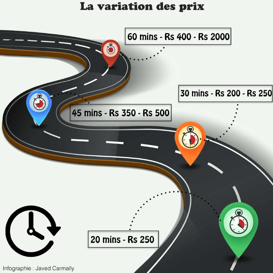 Rs 400 et Rs 2 000. Dans ce cas de figure, le moniteur prend souvent plusieurs apprenants pendant la même séance. Pour 30 minutes, le prix passe à Rs 200-250. Certaines auto-écoles prennent entre Rs 350 et Rs 500 pour trois quarts d’heure ou Rs 250 pour 20 minutes. Pour ceux qui proposent des leçons dans la capitale et qui empruntent les mêmes parcours que les examinateurs, les prix sont certainement différents.