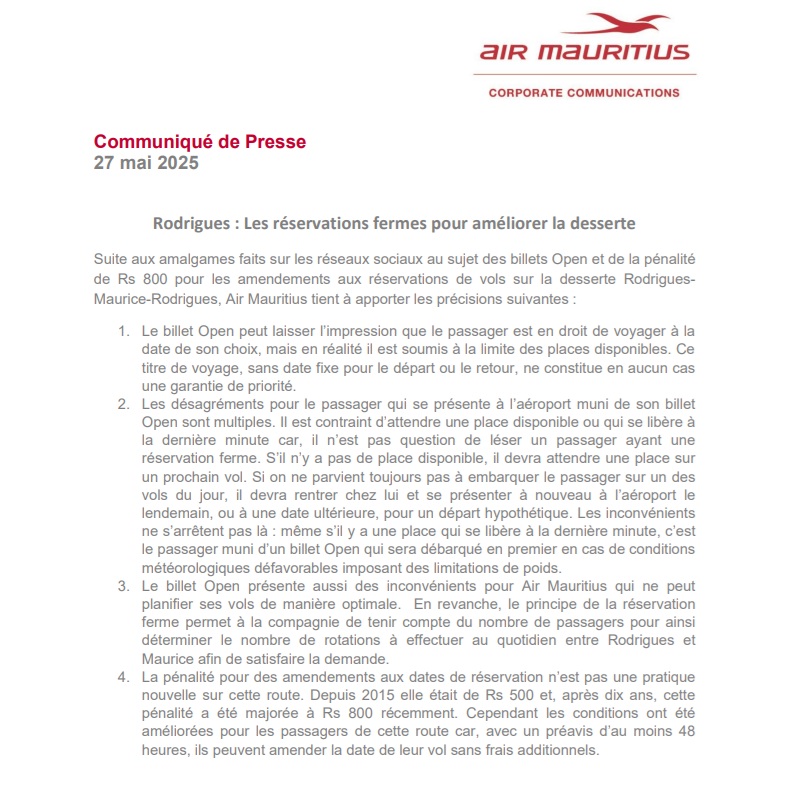 Air Mauritius clarifie la situation entourant les billets « open » pour Rodrigues. Dans un communiqué émis ce mardi 27 mai, la compagnie d'aviation nationale répond aux récentes critiques circulant en ligne concernant ces billets dits « ouverts ». Elle précise que les billets « open » ne garantissent en aucun cas une priorité d’embarquement.