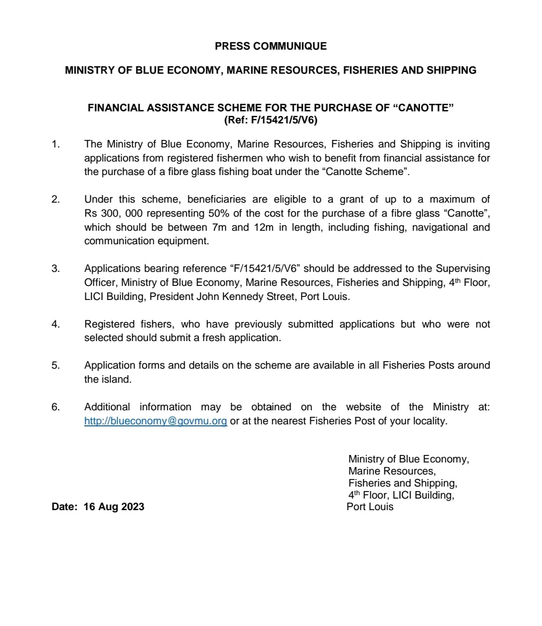 Une subvention de 50 % de la somme maximale de Rs 300 000 leur sera accordée pour l’achat d’un canot en fibre de verre, mesurant entre 7 et 12 mètres.