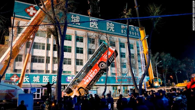 L'effondrement de la chaussée a entraîné la formation d'une cavité de 80 mètres carrés. Une vidéo publiée par la télévision publique anglophone CGTN montre une personne sortie du trou par des secouristes.