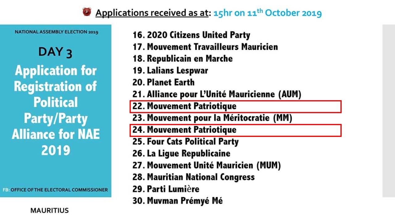 Il faut aussi noter que le mercredi 9 octobre, un autre parti politique s’est également enregistré avec le nom de «MP».