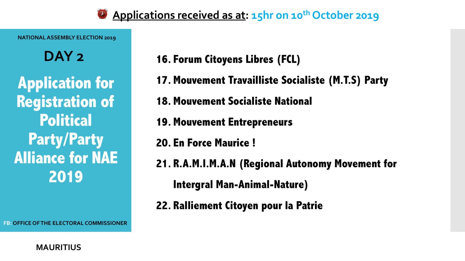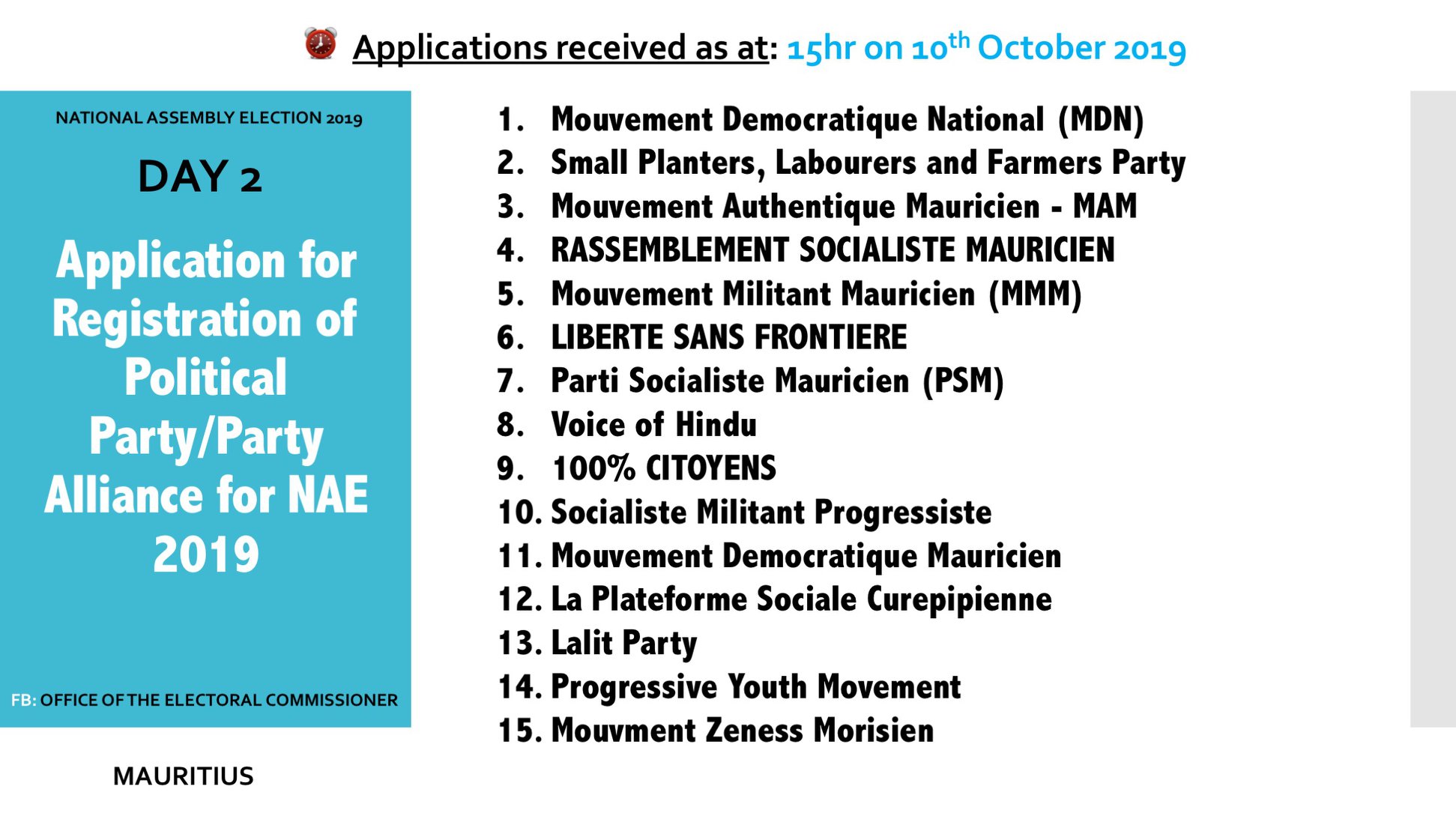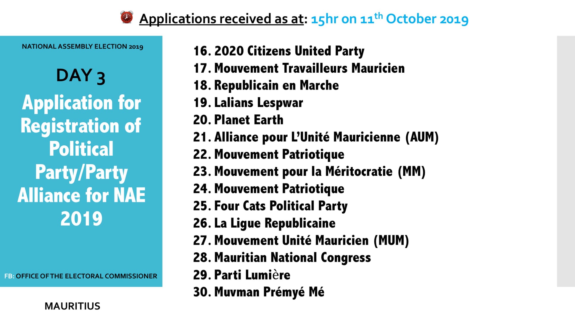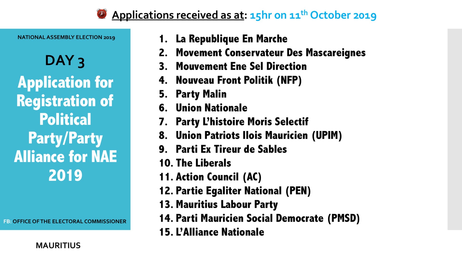 15 enregistrements ont été reçus. Soit, 14 partis politiques et aussi l’enregistrement de l’Alliance Morisien (MSM/ML).