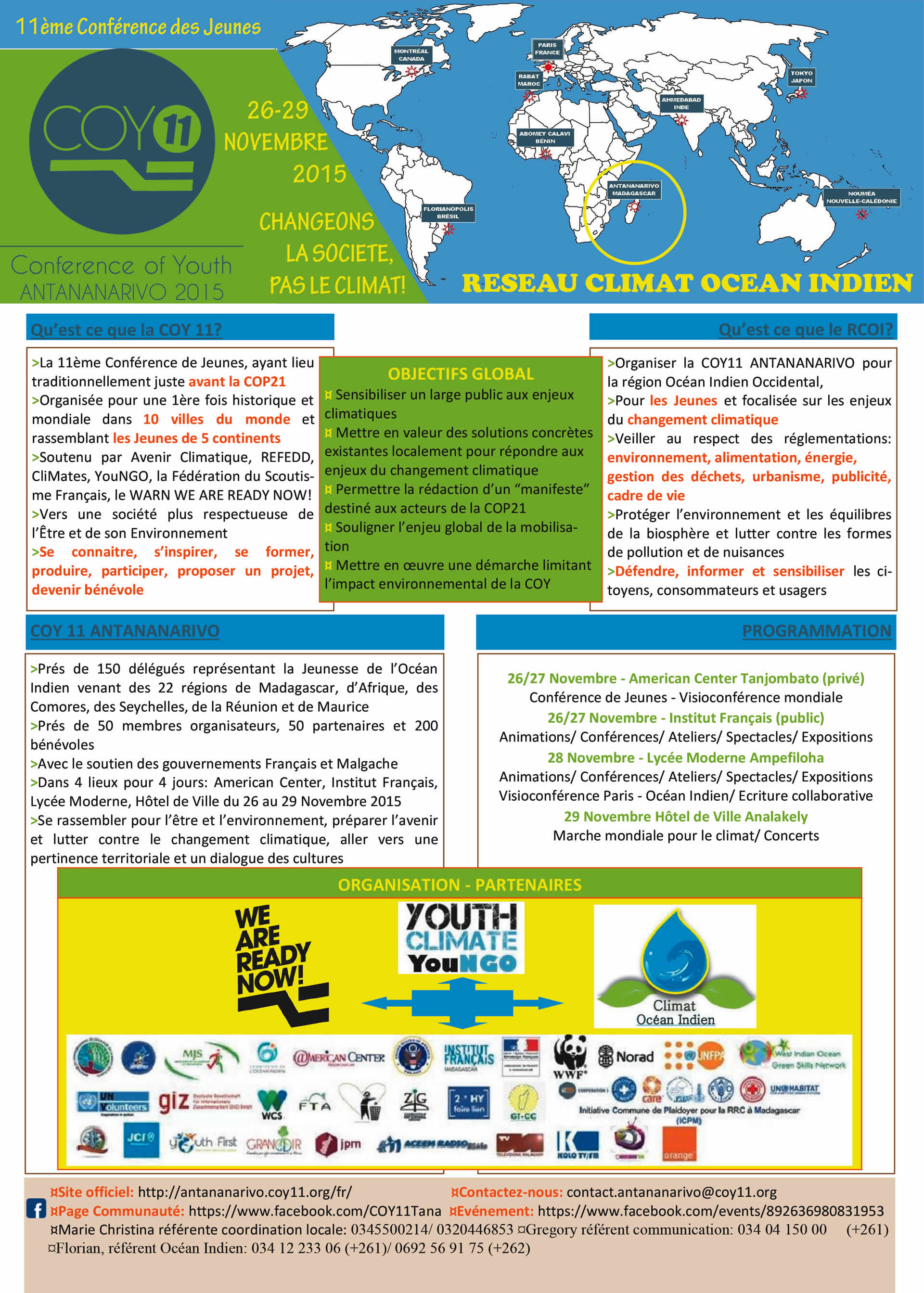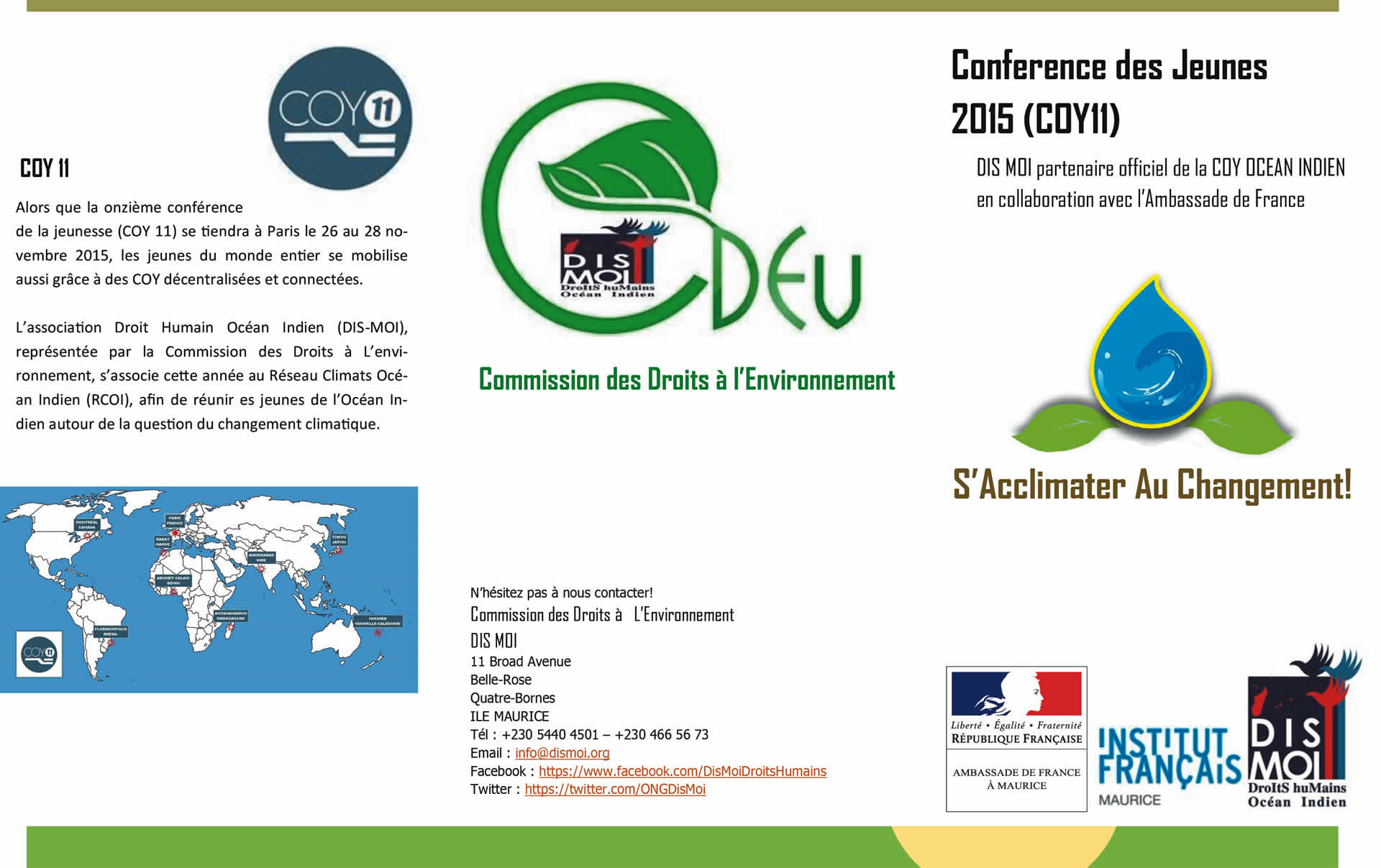Aussi, afin de permettre aux jeunes mauriciens de se mobiliser autour des enjeux climatiques, DIS-MOI en partenariat avec l’ambassade de France, organiseront le lundi 30 novembre une conférence des jeunes à l’Institut Français de l’île Maurice. Soutenue par diverses ONG, telles que Roches-Noires Eco Marine, FORENA, MOVE, La Green Building Council of Mauritius et la Sustainable Agriculture Organisation, cette journée d’activités se déroulera de 13 à 16 heures et permettra aux jeunes de participer à des débats et de s’exprimer tant sur les thèmes régionaux que mondiaux. [padding-p-1 custom_class=""][/padding-p-1] [[{"type":"media","view_mode":"media_large","fid":"5127","attributes":{"class":"media-image aligncenter wp-image-8553 size-full","typeof":"foaf:Image","style":"","width":"1920","height":"1207","alt":"Conference des Jeunes 2015 (COY11)"}}]] [[{"type":"media","view_mode":"media_large","fid":"5128","attributes":{"class":"media-image aligncenter size-full wp-image-8555","typeof":"foaf:Image","style":"","width":"1920","height":"2687","alt":"COP21"}}]]La journaliste Dzamara disparue