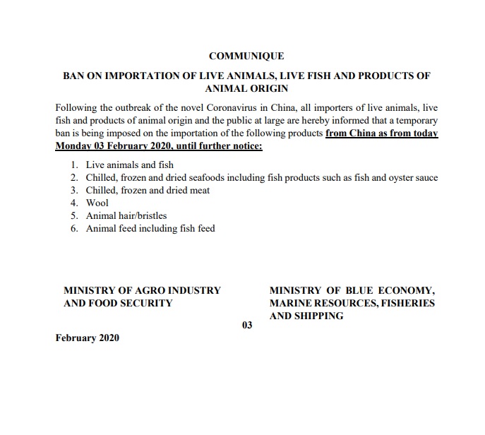 Dans un communiqué conjoint émis par le ministère de l’Agro-industrie et le ministère de l’Economie bleue, des ressources maritimes et de la pêche, il est annoncé que désormais les animaux vivants, y compris les poissons, les produits de la mer séchés et frigorifiés, mais aussi la sauce d’huître, la viande sèche et frigorifiée, la laine, les produits contenant des poils d’animaux et même la nourriture pour animaux sont formellement interdits.