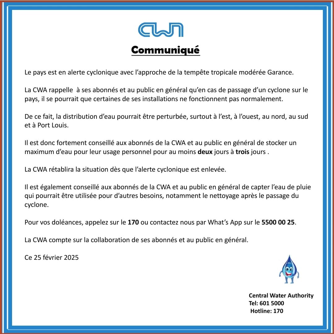 En raison du passage du cyclone, l’approvisionnement en eau pourrait être perturbé dans plusieurs régions, notamment l’Est, l’Ouest, le Nord, le Sud et Port-Louis.