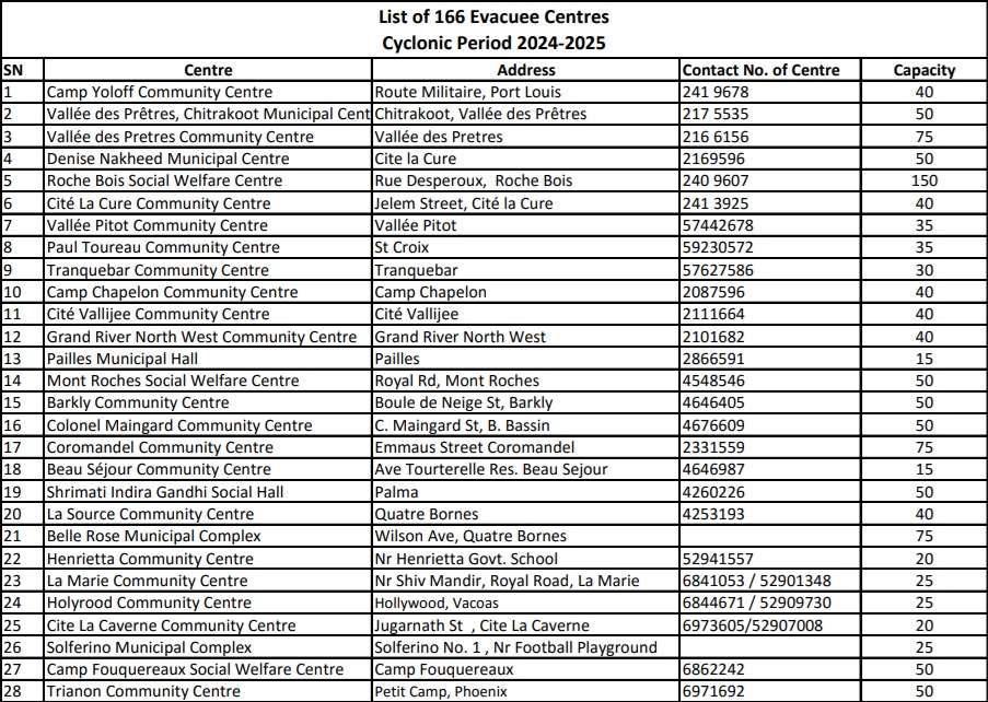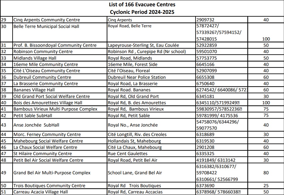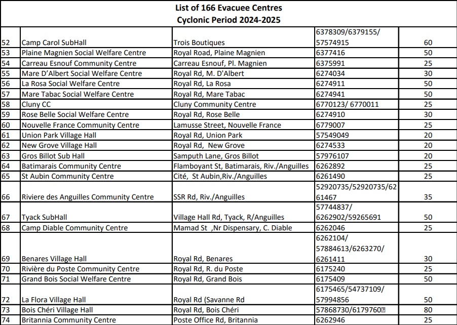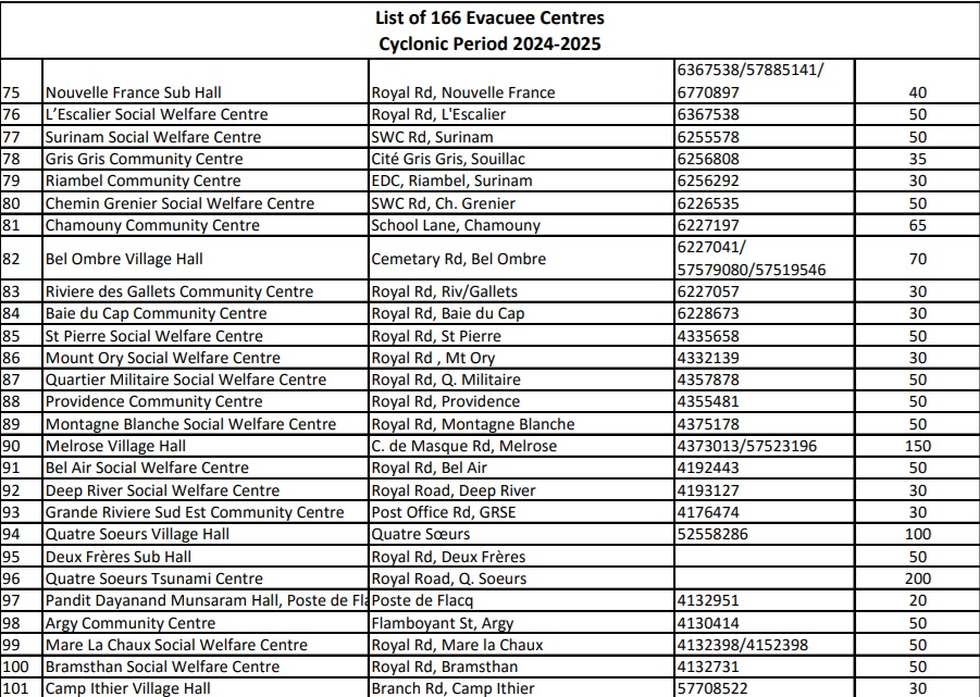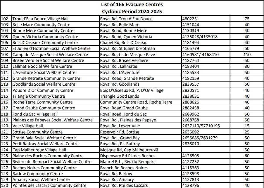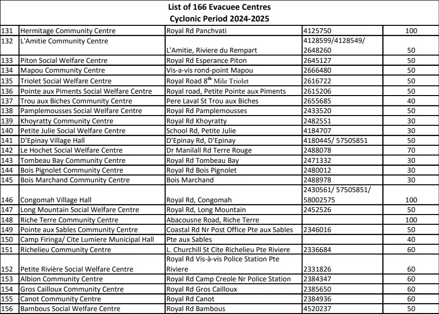 166. C’est le nombre de centres d'évacuation mis à disposition à travers l’île pour accueillir d’éventuels sinistrés du cyclone Garance. Ces centres ont ouvert leurs portes à la suite de l’alerte cyclonique de classe 3, émise par la station météorologique de Vacoas à 16 h 10, ce mercredi 26 février. Vous trouverez ci-dessous la liste des 166 centres d'évacuation disponibles :