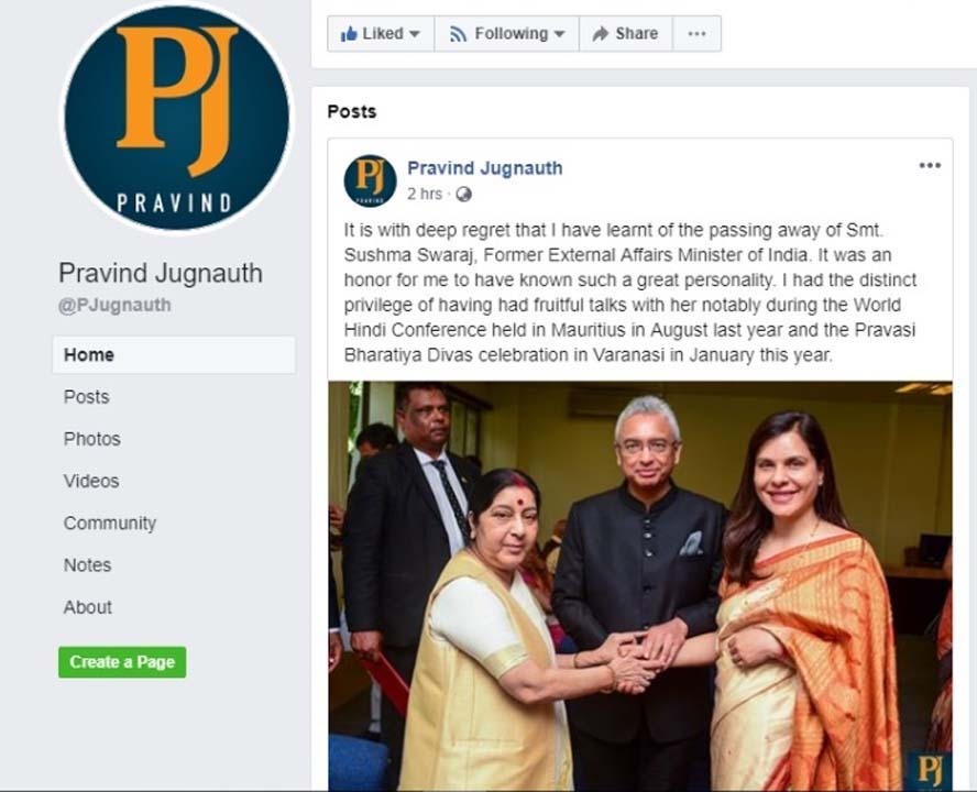 Pravind Jugnauth a indiqué que c’était un honneur pour lui d’avoir connu une telle personne. Le chef du gouvernement n’a pas manqué de mentionner les dernières rencontres qu’il a eues avec Sushma Swaraj, notamment lors de sa visite à Maurice pour le World Hindi Conference en août 2018 et le Pravasi Bharatiya Divas celebration in Varanasi en janvier.