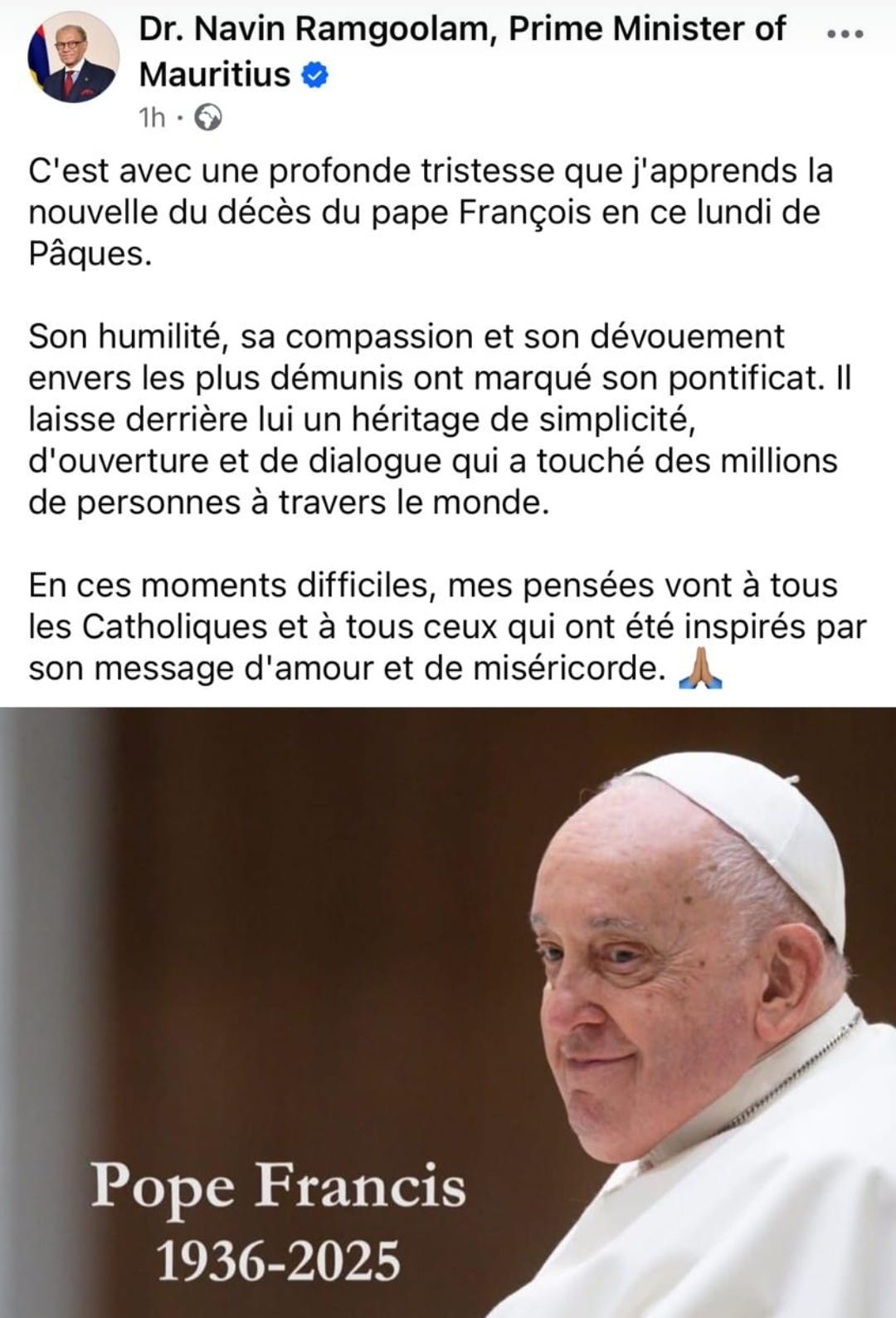 “C'est avec une profonde tristesse que j'apprends la nouvelle du décès du pape François en ce lundi de Pâques”, a écrit le Premier ministre, Navin Ramgoolam, sur sa page Facebook, ce lundi 21 avril.