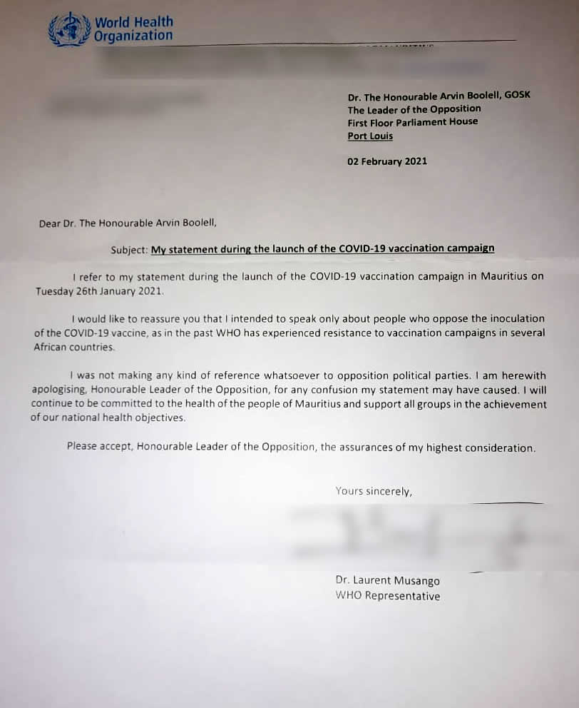 « Je ne faisais aucune référence aux partis politiques de l'opposition. Je m'excuse pour toute confusion que ma déclaration a pu causer », a fait ressortir le représentant de l’Organisation mondiale de la Santé (OMS) à Maurice. Et d’ajouter : « Je continuerai à m’engager pour la santé de la population mauricienne et à soutenir tous les groupes dans la réalisation de nos objectifs de santé publique ».