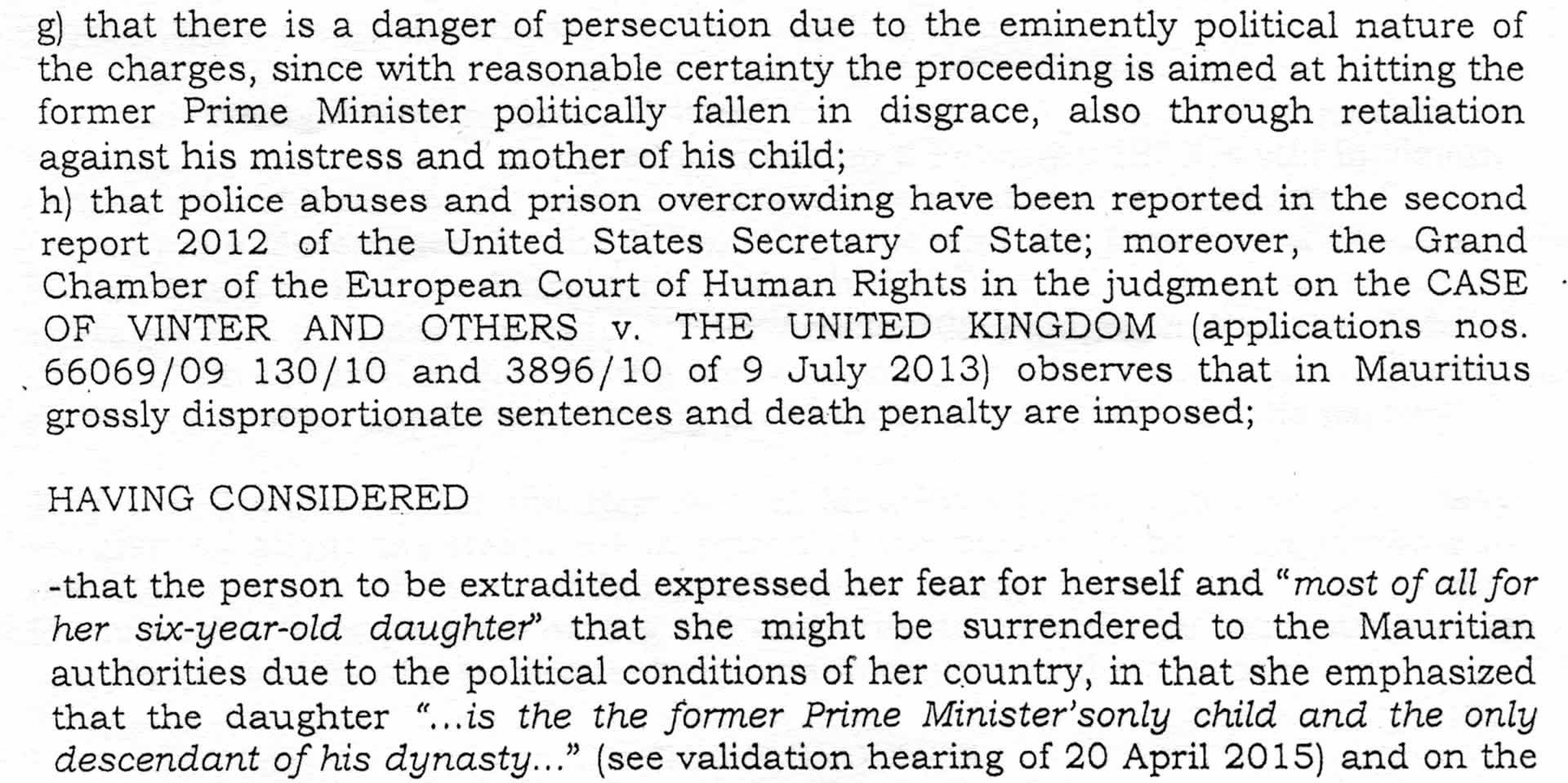 Elle se pose ainsi la question de savoir si les « intérêts » de sa fille seront préservés lorsqu'elle sera remise entre les mains des autorités mauriciennes. Elle n’hésite pas non plus de citer allégrement un rapport du Département d'Etat américain datant de 2012 et un jugement de la Cour européenne des Droits humains d’il y a deux ans quant aux lourdes peines de prison « imposées » à Maurice.