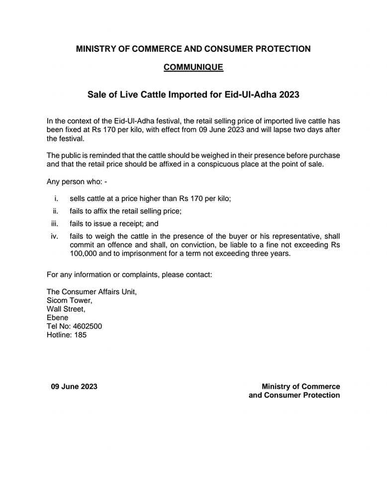 Le prix du bœuf sur pattes est fixé à Rs 170 le kilo dans le cadre de la fête Eid-ul-Adha. C’est ce qui ressort d’un communiqué émis par le ministère du Commerce.