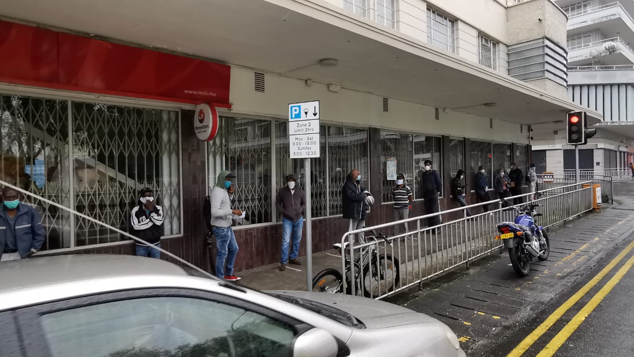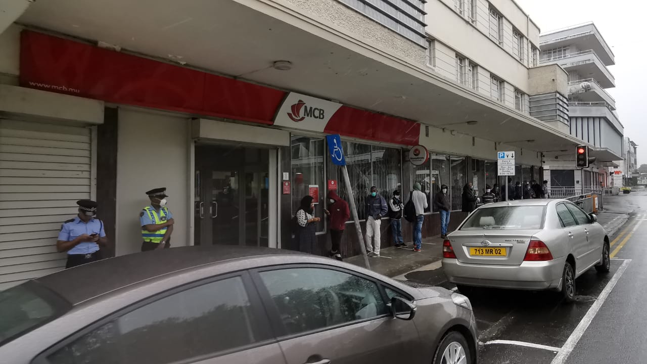 Malgré le mauvais temps, une longue file d’attente a été notée devant le supermarché Sik Yuen et devant la MCB vers 8 h ce matin. Sur les images, on peut constater que le ‘social distancing’ est respecté.