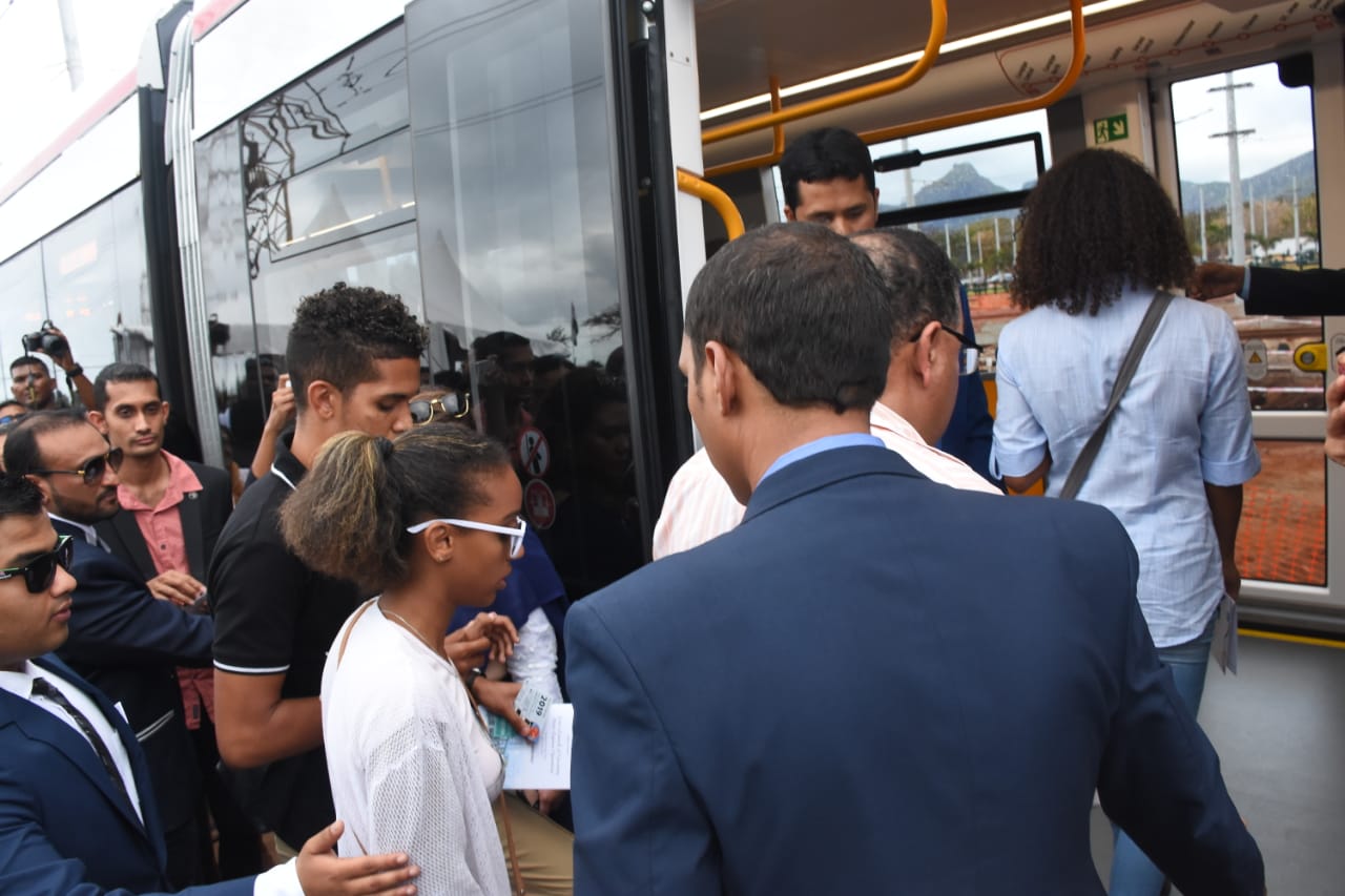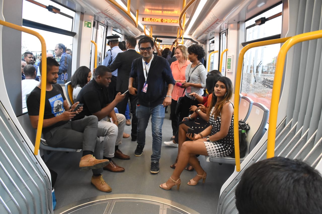 A bord du Metro Express pour ce trajet inaugural se trouvent le Premier ministre, Pravind Jugnauth, des ministres, des invités et des journalistes. Dans la foule, plusieurs personnes sortent leurs téléphones cellulaires pour immortaliser l'évènement.
