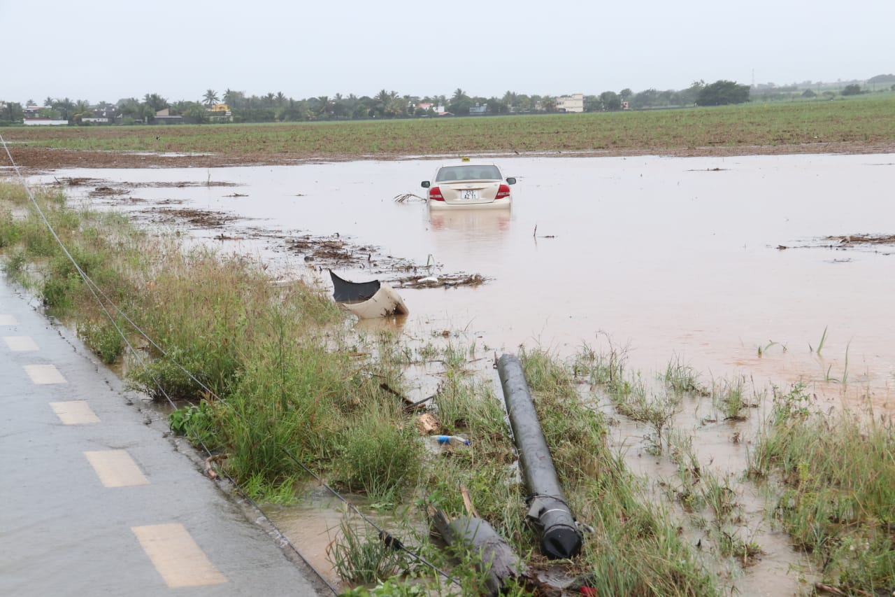 Le véhicule a terminé sa course dans un champ envahi par l'eau boueuse.