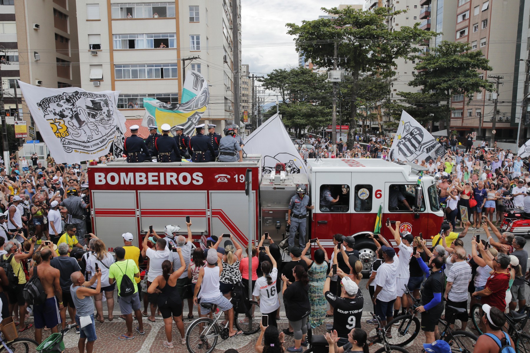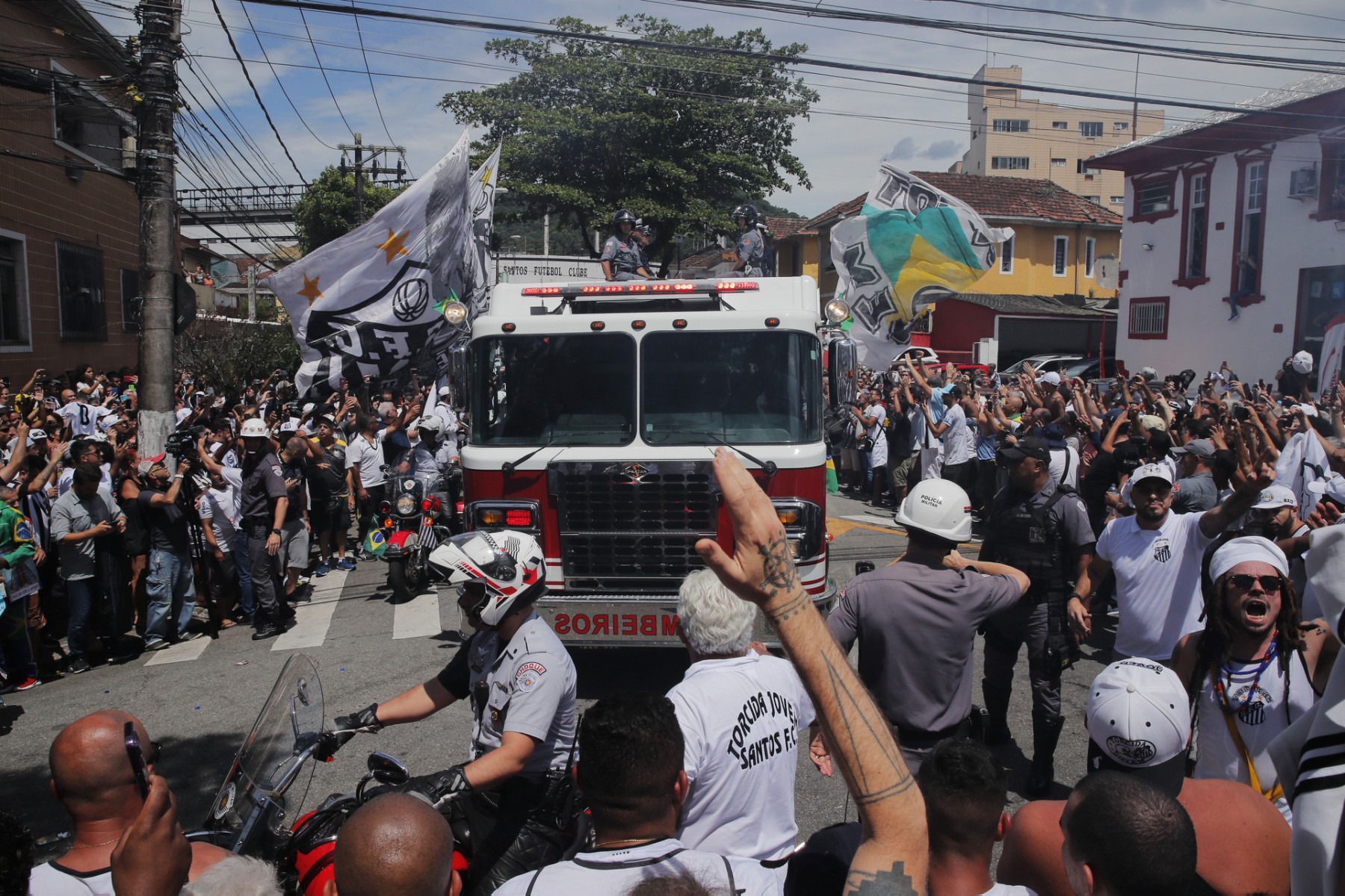 Il a ensuite été hissé sur le haut d'un camion de pompiers, puis recouvert de deux drapeaux: celui du Brésil et celui du Santos FC.