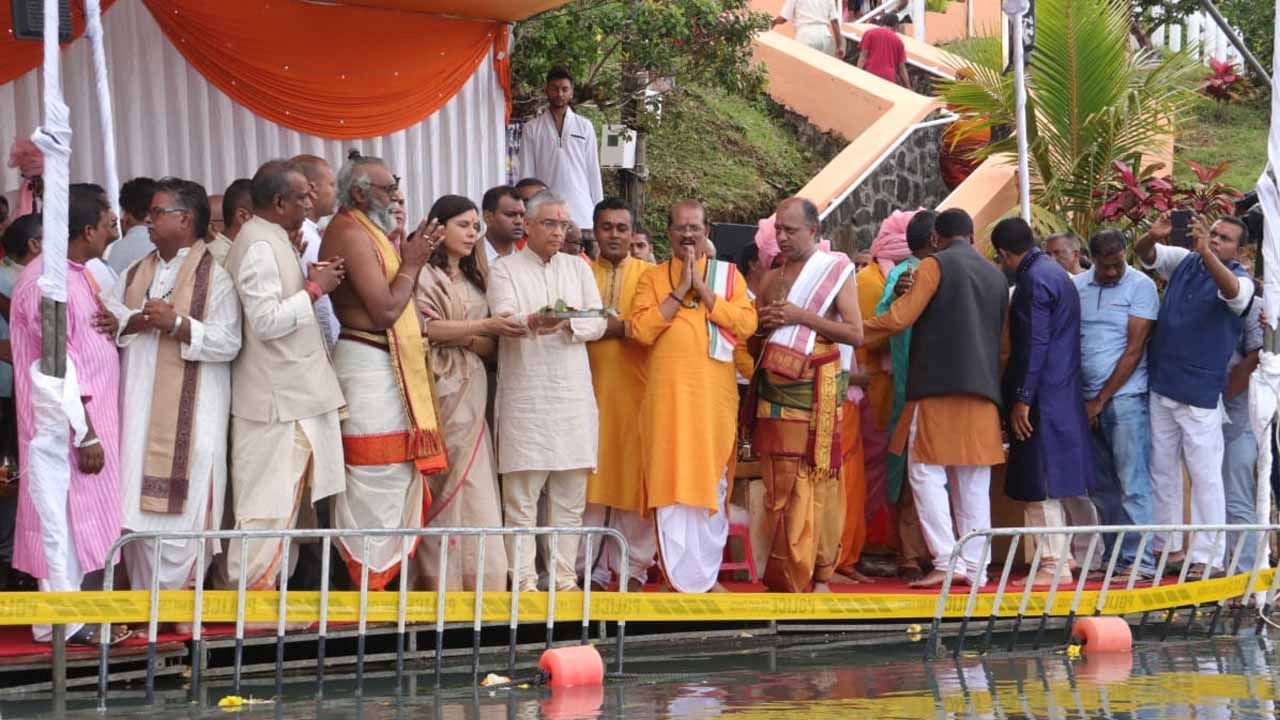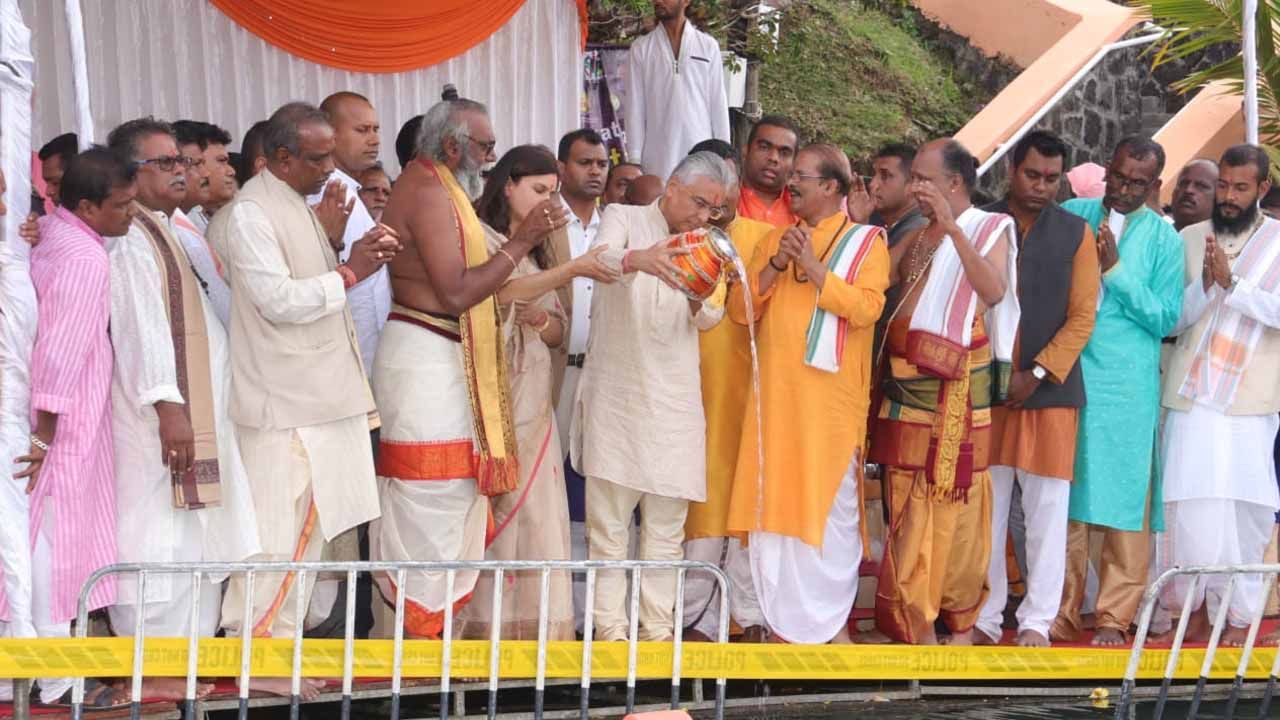 Cette prière rend hommage à la déesse de l’eau, Ganga. Ainsi, l’eau ramenée du Kumbh Mela par Pravind Jugnauth de son voyage en Inde le 24 janvier dernier, a été versée dans le lac sacré du Ganga Talao.