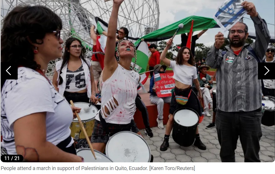 À Caracas, des centaines de manifestants pro-palestiniens ont protesté devant le siège des Nations Unies pour le Venezuela, arborant un immense drapeau palestinien. Ils ont remis une pétition à l'ONU appelant à la fin du « génocide » des Palestiniens.