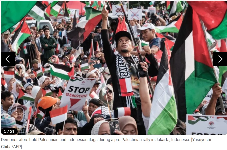 Dans la capitale indonésienne, Jakarta, plus de 1 000 manifestants pro-palestiniens se sont rassemblés devant l'ambassade des États-Unis, exigeant que Washington, principal fournisseur d'armes et allié d'Israël, cesse d'envoyer des armes à Israël.