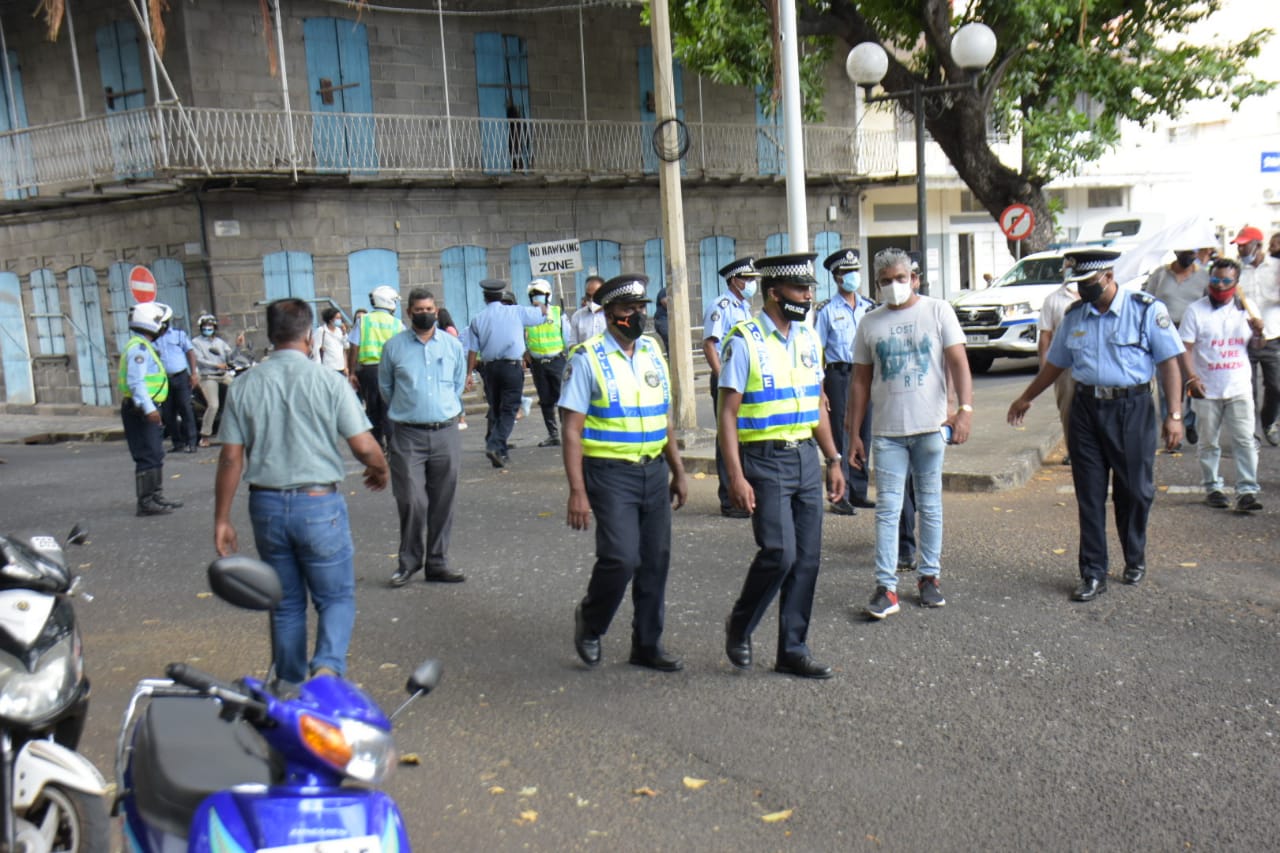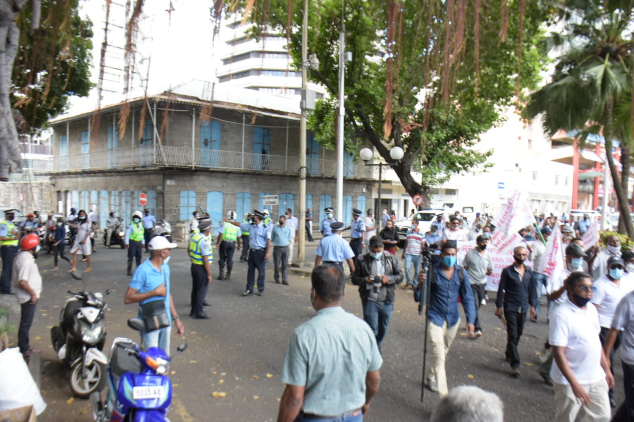 La marche pacifique se déroule en présence d’une forte escorte policière. Le syndicaliste Jack Bizlall est parmi ceux présents au jardin de la Compagnie. Présence également remarquée de l'activiste social,  Bruneau Laurette, au jardin de la Compagnie où il a rejoint les membres de la Federation of Hotels Taxis Association.  La marche a terminé peu avant  13 h.