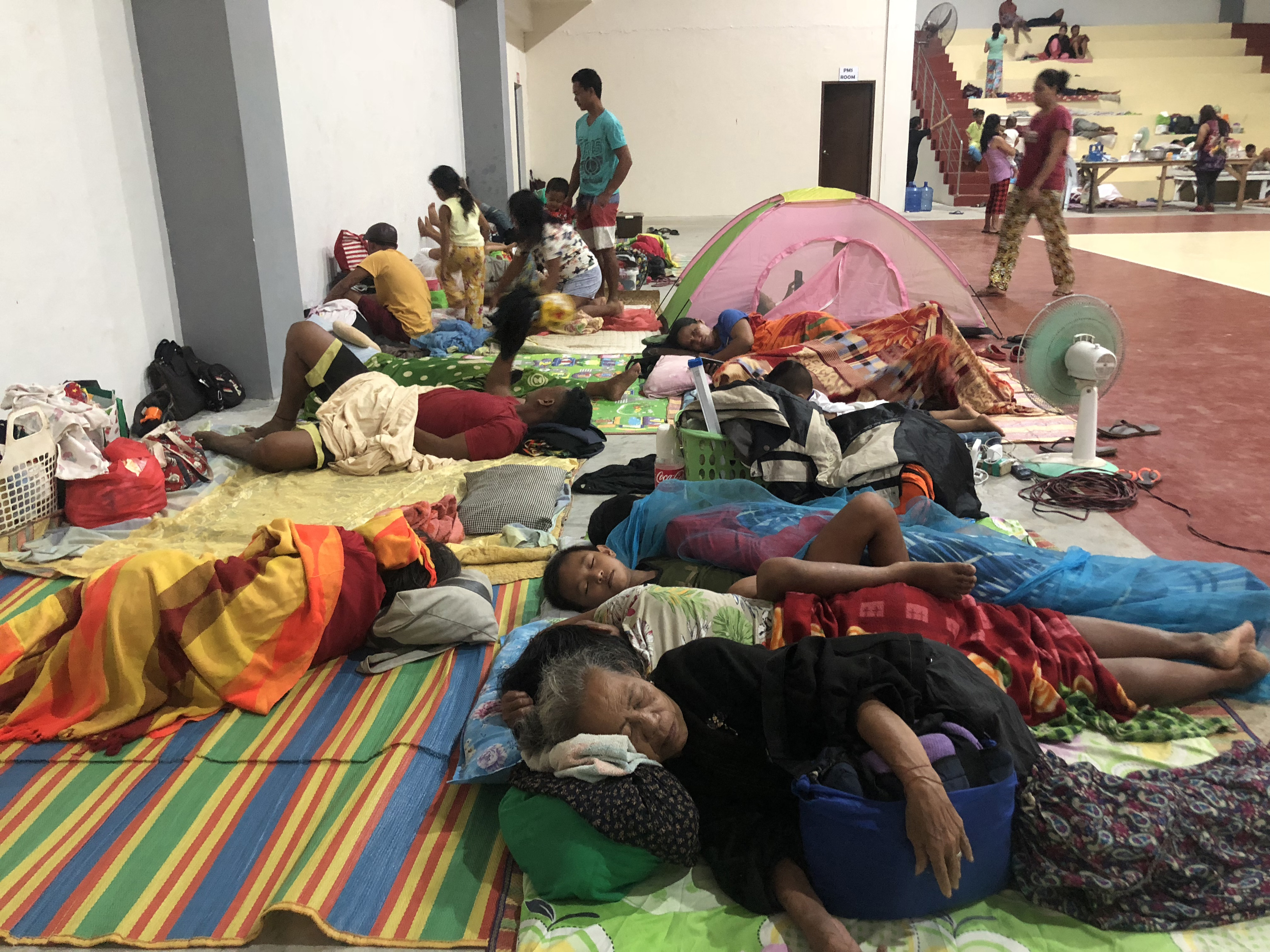 Dans la ville de Dapa, des familles dormaient à même le sol d'un complexe sportif transformé en refuge.