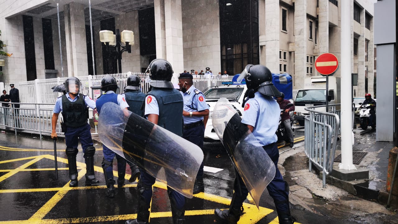La police a déployé des éléments de la Special Supporting Unit (SSU) aux abords de la New Court House, Port-Louis, place afin d'assurer la sécurité des sympathisants de la famille Kistnen et des membres du public.