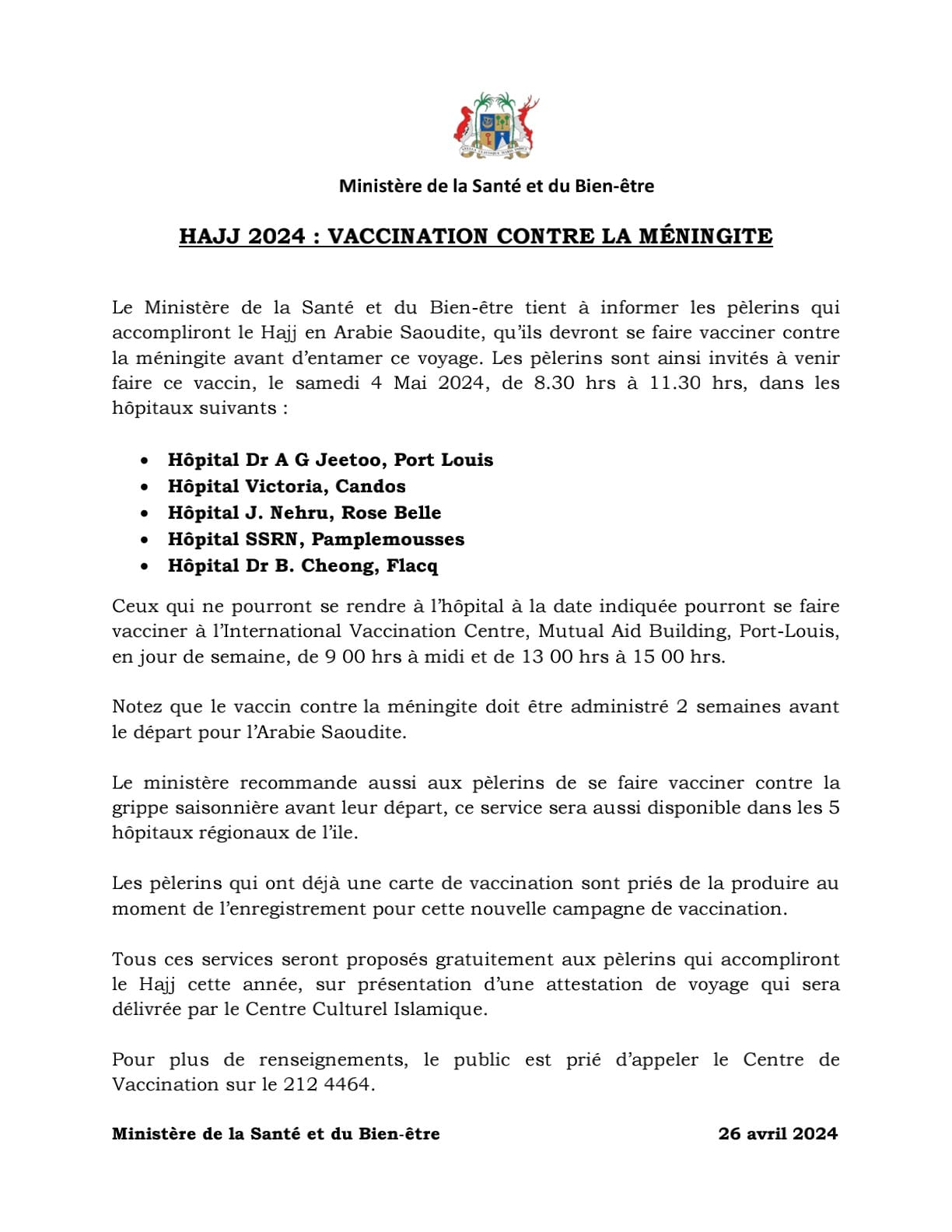 Ceux ou celles qui ne pourront pas se rendre à l’hôpital à la date indiquée pourront se faire vacciner à l’International Vaccination Centre, Mutual Aid Building, à Port-Louis en jour de semaine soit de 09 h 00 à midi et de 13 h 00 à 15 h 00. Retrouvez ci-dessous le communiqué dans son intégralité.