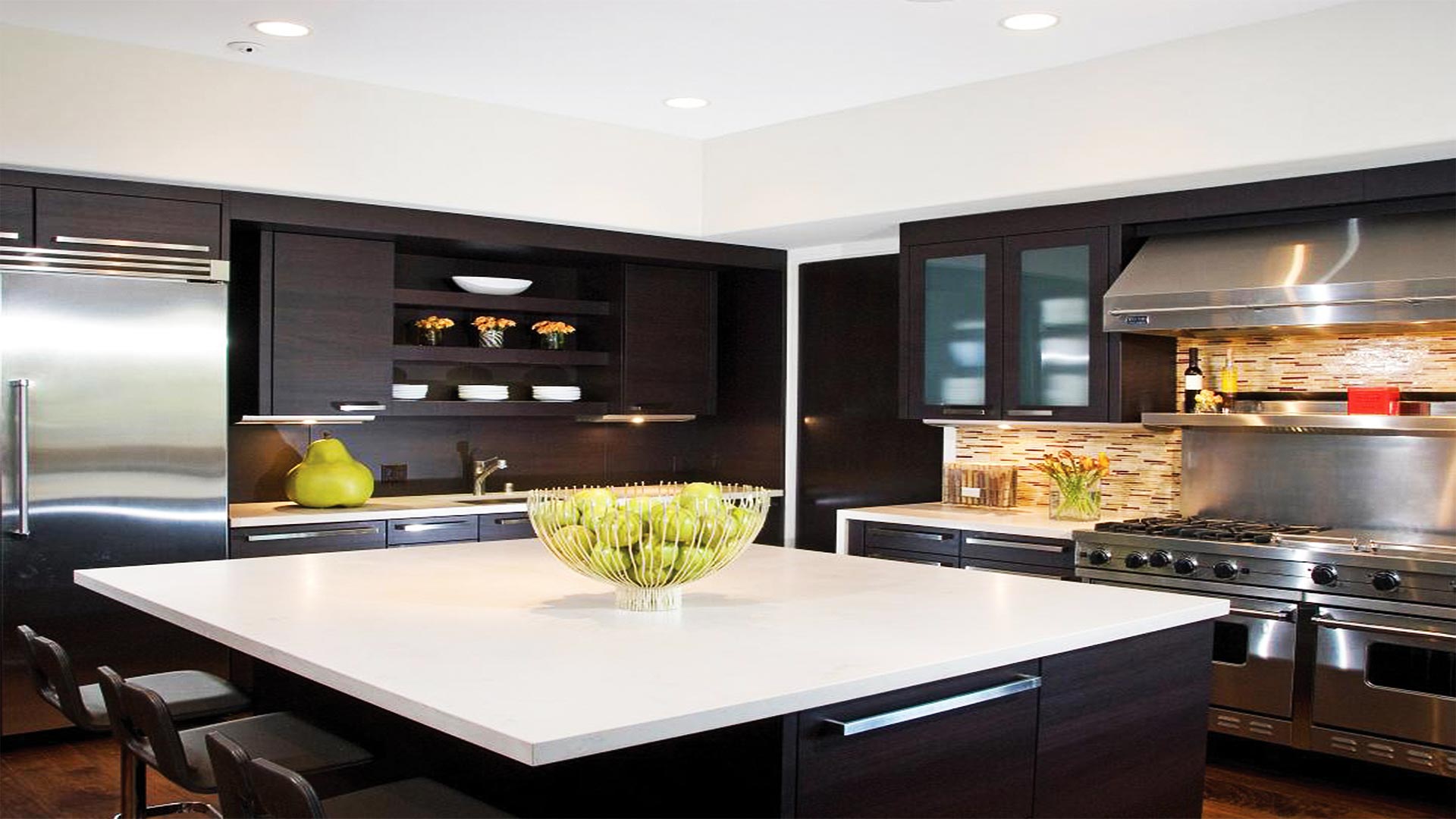 Transitional kitchens are a blend of traditional and modern sophistication with high end marble countertops, built in breakfast nook, sleek wood-veneered cabinets and ebonised flooring.Multi-functional living room