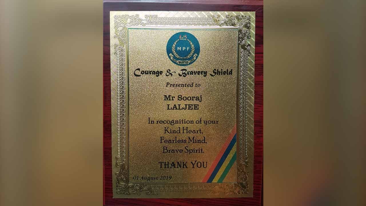 Il se dit fier de son acte de courage et reste motivé à agir à nouveau de la sorte. Sooraj Laljee, un entrepreneur de 38 ans, a été honoré pour son acte de bravoure, le 1er août dernier. C’était lors de la Passing Out Ceremony de la force policière que l’habitant de Phoenix s’est vu remettre le Courage and Bravery Shield par le Premier ministre, Pravind Jugnauth. Une récompense obtenue pour sa contribution à la société.