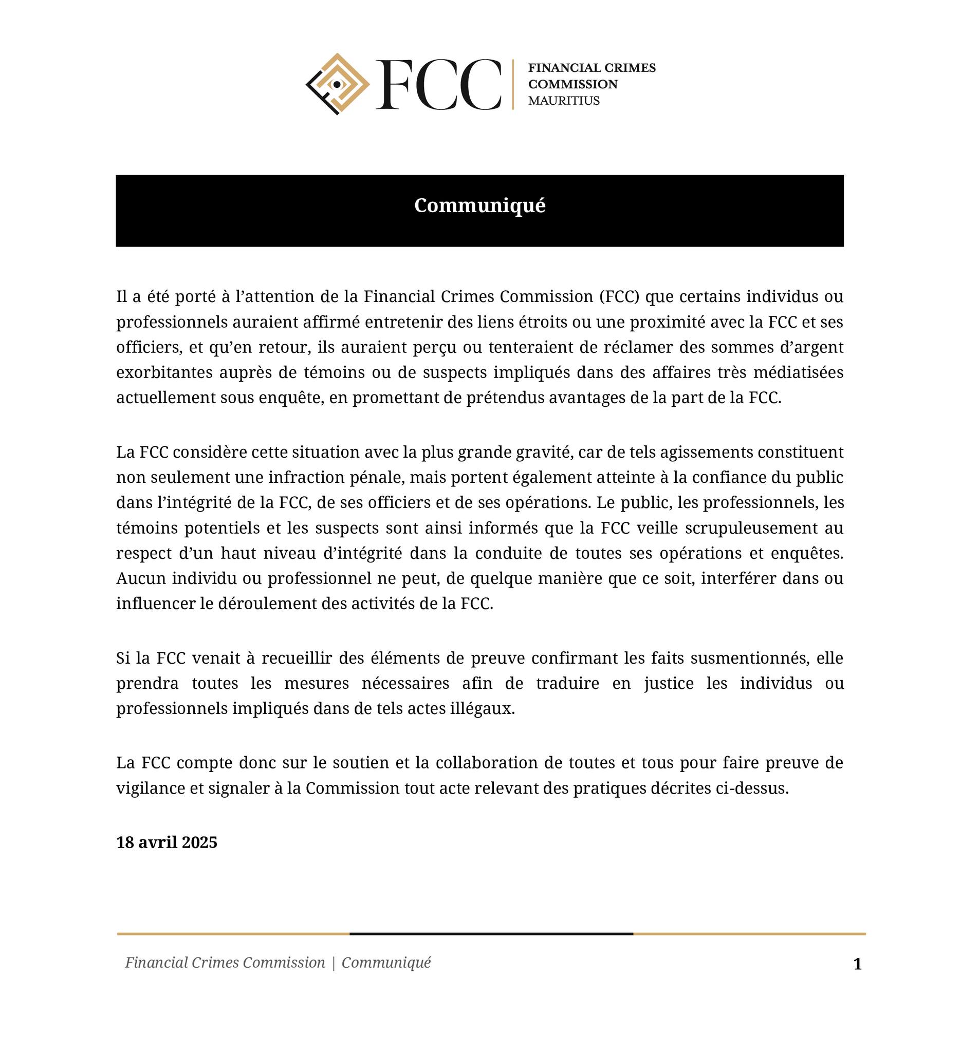 La Financial Crimes Commission (FCC) a été informée que des individus ou professionnels prétendent entretenir des liens avec elle, en exigeant des sommes d’argent en échange de prétendus avantages. Ces pratiques constituent des infractions pénales graves et nuisent à la confiance du public envers l’intégrité de la FCC. La FCC réaffirme son engagement à garantir l’intégrité de ses enquêtes et opérations. Toute personne impliquée dans de tels actes illégaux sera traduite en justice. Le public est invité à signaler tout comportement suspect à la FCC. C’est ce qui ressort d’un communiqué émis par la FCC, ce vendredi 18 avril.