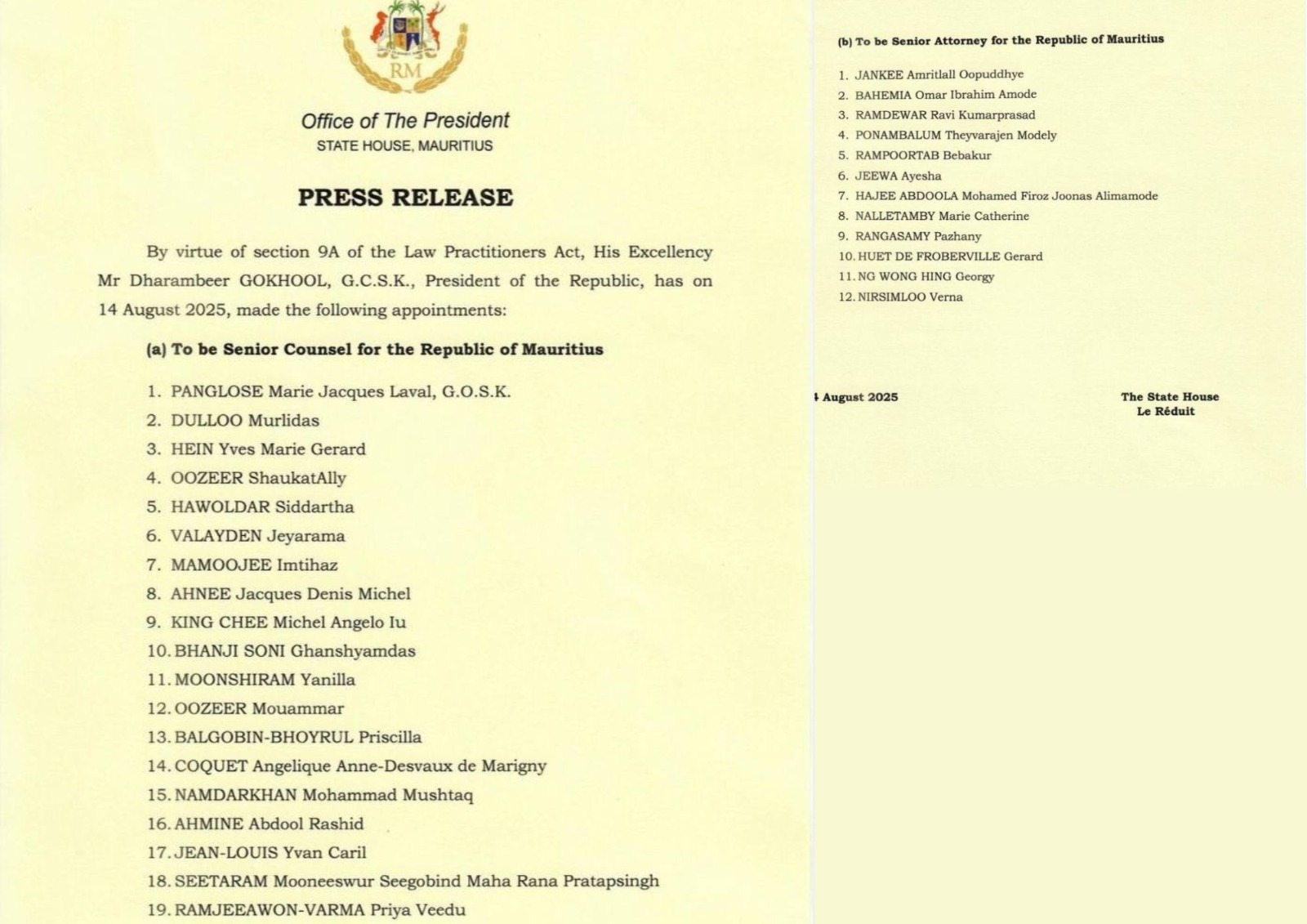 Le président de la République, Dharam Gokhool, a procédé ce jeudi à la nomination de 19 Senior Counsels. Parmi eux figurent le Directeur des Poursuites Publiques, Me Rashid Ahmine, ainsi que les avocats Rama Valayden, Jacques Panglose, Siddhartha Hawoldar, Murlidas Dulloo — plus connu sous le nom de Madan Dulloo —, Yanilla Moonshiram, Priscilla Balgobin-Bhoyrul, Imtihaz Mamoojee et Anne Desvaux de Marigny Coquet.