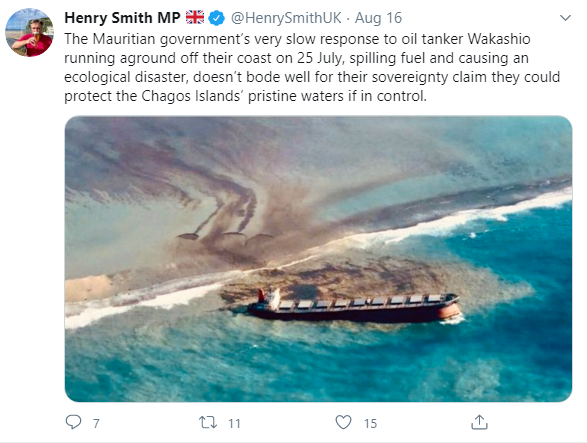Il écrit ainsi : « La réponse très lente du gouvernement mauricien à l'échouement du navire ravitailleur au large des côtes du pays le 25 juillet, déversant du carburant et provoquant une catastrophe écologique, n’est pas de bon augure pour sa [revendication de] souveraineté quand on pense à la protection des eaux cristallines qu'il fournirait à l'archipel des Chagos, si celui-là passait sous son contrôle. »