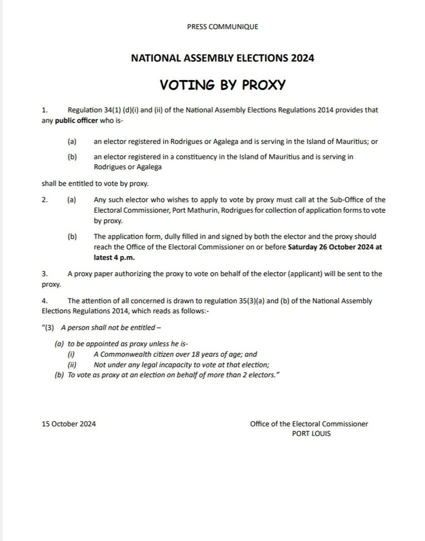 Les fonctionnaires inscrits comme électeurs à Rodrigues ou Agalega, mais qui sont actuellement en poste à Maurice, ainsi que ceux inscrits à Maurice et en poste à Rodrigues ou Agalega, peuvent bénéficier du vote par procuration. C’est ce que précise un communiqué du bureau du Commissaire électoral.