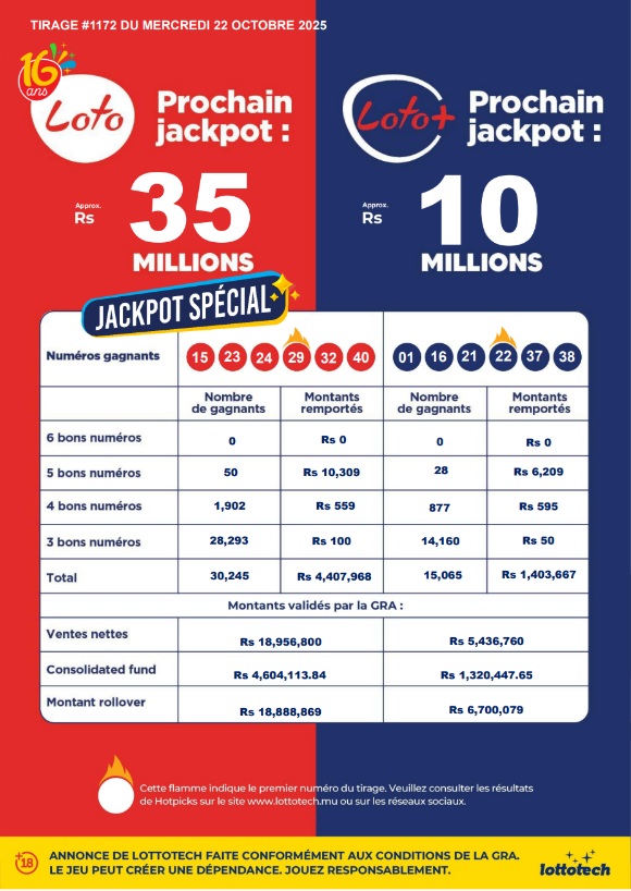 Aucun joueur n’a trouvé la combinaison gagnante du tirage du Loto ni celle du Loto Plus, ce mercredi 22 octobre. C’est ce qui ressort du communiqué émis par Lottotech ce soir. À l’occasion du 16ᵉ anniversaire du Loto, un jackpot spécial d’environ Rs 35 millions sera en jeu ce samedi tandis que celui du Loto Plus atteindra environ Rs 10 millions.
