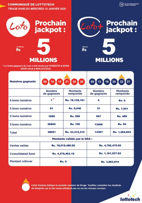 Le Loto a fait un grand gagnant du jackpot de ce mercredi 15 janvier. Ce dernier remporte Rs 19,1 millions. Le ticket gagnant a été vendu par Dussoye & Sons Shop, situé à Bon-Accueil. C’est ce qui ressort du communiqué émis par Lottotech ce soir. Le prochain jackpot du Loto passera à au moins Rs 5 millions et celui du Loto Plus passent à environ Rs 5 millions.