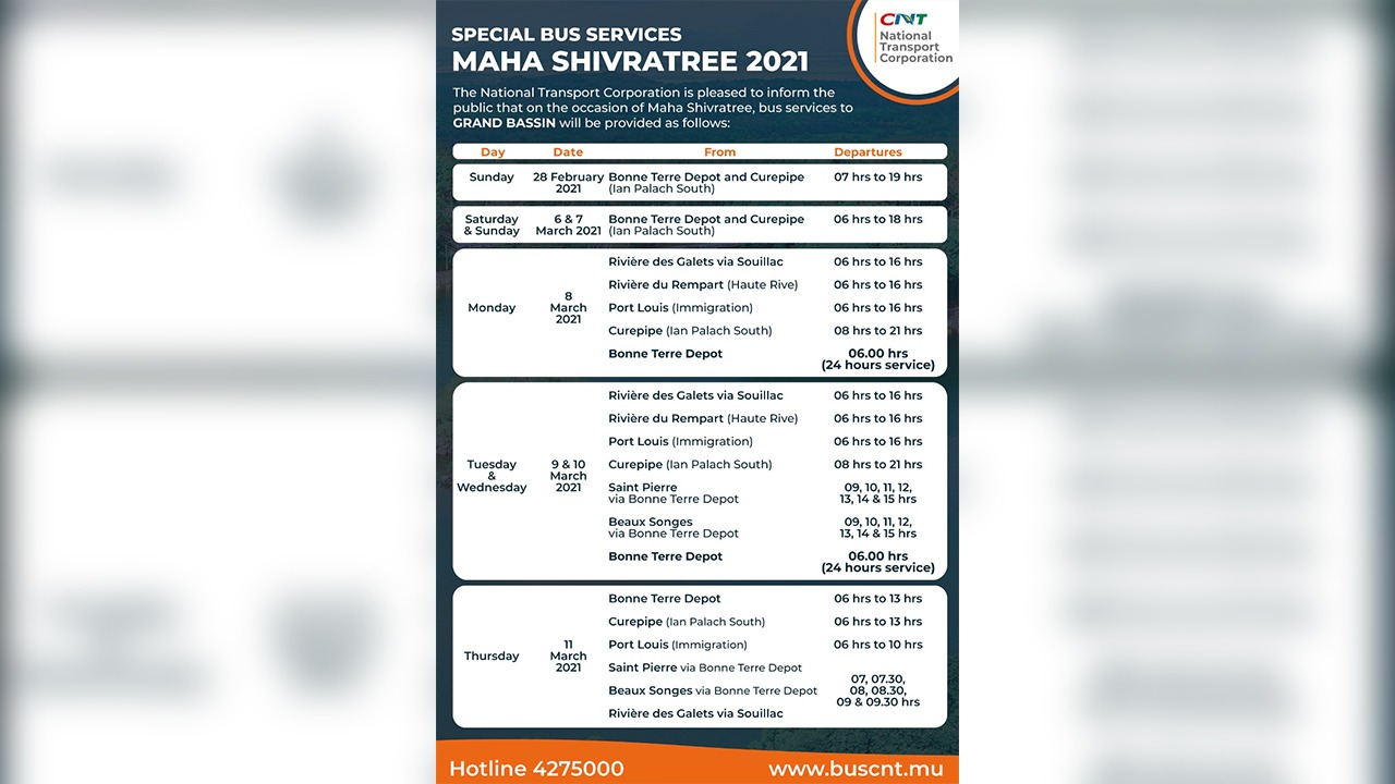 En marge de la fête de Maha Shivaratree, qui sera célébrée le 11 mars prochain, la Corporation nationale de Transport mettra en place un service spécial pour se rendre du côté de Grand-Bassin.