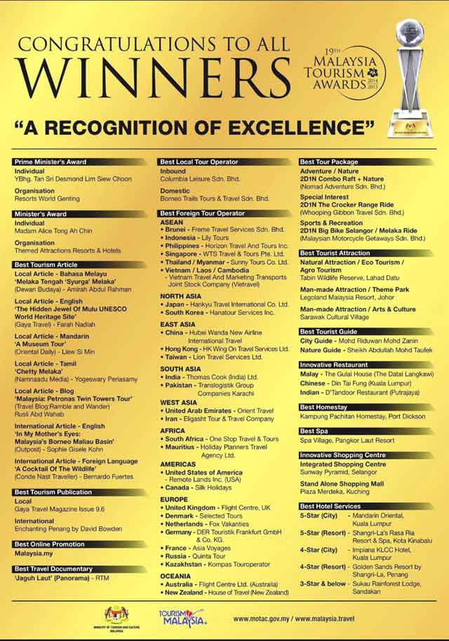 Malaysia Tourism Awards 2014/2015: Mauritian agency bags Best Foreign Tour Operator Award