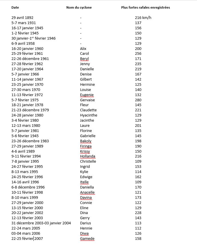 Depuis 1892, les services météorologiques de Vacoas ont classé 44 cyclones comme étant « historiques » de par leur force et/ou des dégâts provoqués. Le plus intense d’entre eux est Gervaise qui a traversé l’île du 5 au 7 février 1975.