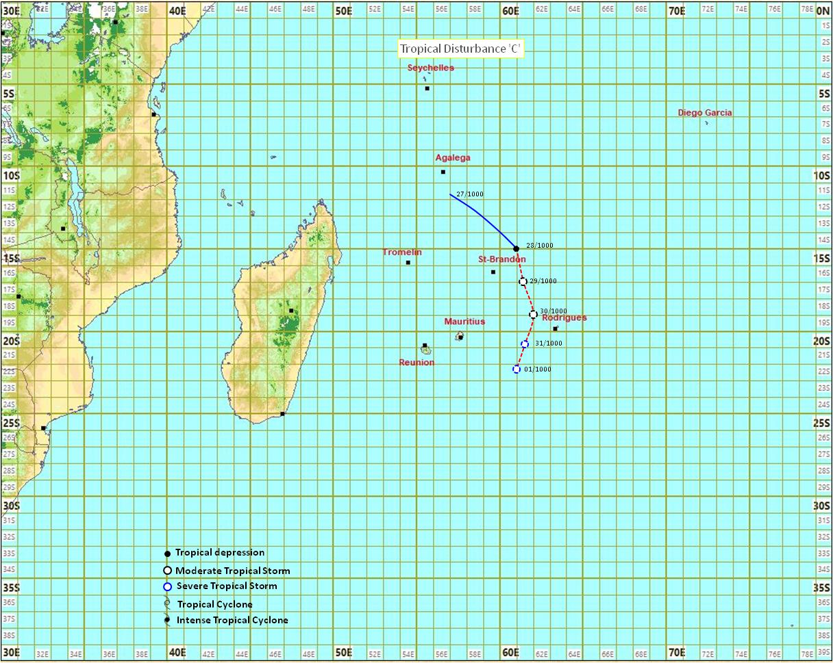 A 16h00, la perturbation tropicale était située à environ 580 km au nord-nord-ouest de Rodrigues et à quelque 670 km au nord-est de Maurice. Elle se déplace dans une direction du sud-sud-est à environ 15 km/h. Sur cette trajectoire, elle s'approche davantage de Rodrigues.