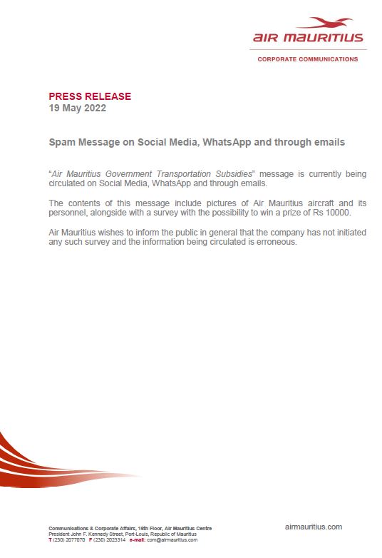 Air Mauritius met en garde contre des spams qui circulent actuellement sur les réseaux sociaux.
