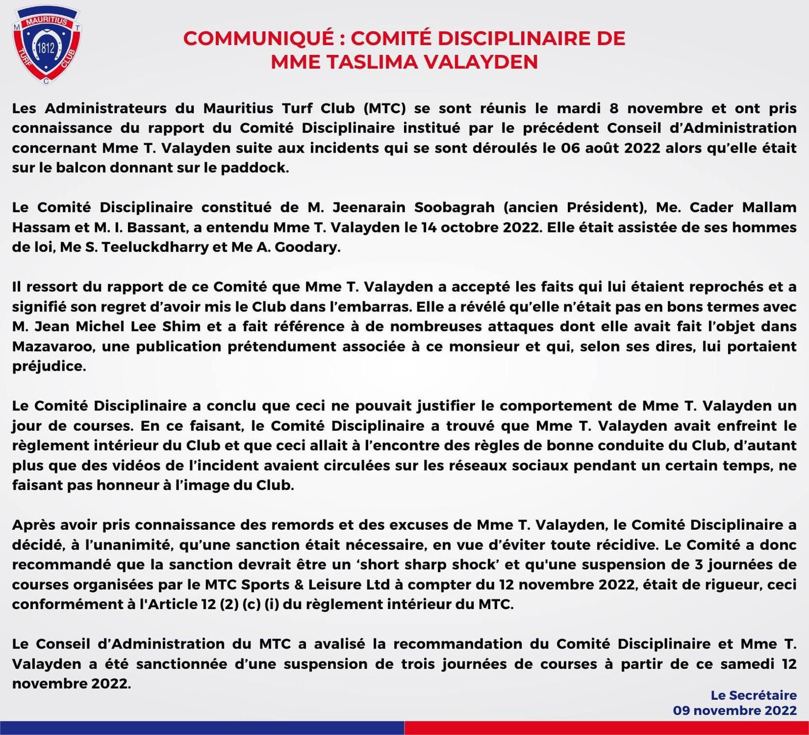 Dans un communiqué émis ce mercredi 9 novembre, le Mauritius Turf Club précise que les administrateurs du Mauritius Turf Club (MTC) se sont réunis le mardi 8 novembre et ont pris connaissance du rapport du comité disciplinaire institué suite aux incidents qui se sont déroulés le 6 août 2022, alors que Taslima Valayden, membre du club, était sur le balcon donnant sur le paddock.