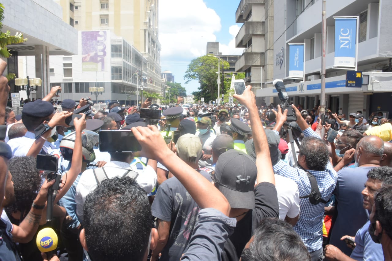 La foule, qui s’était massée devant la cathédrale Saint-Louis un peu plus tôt, dans le cadre d’un rassemblement de soutien à la famille Kistnen, organisé par l’activiste social, Bruneau Laurette, s’est déplacée devant la New Court House.
