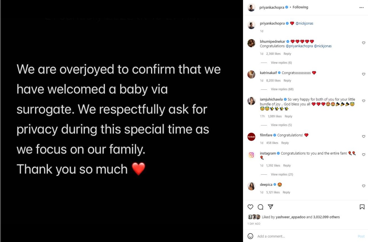 C’est une fille ! L’actrice indienne, Priyanka Chopra et son époux, Nick Jonas, ont accueilli leur premier enfant, né par mère porteuse. L’ancienne Miss World a fait cette annonce sur son compte d’Instagram, vendredi 21 janvier.