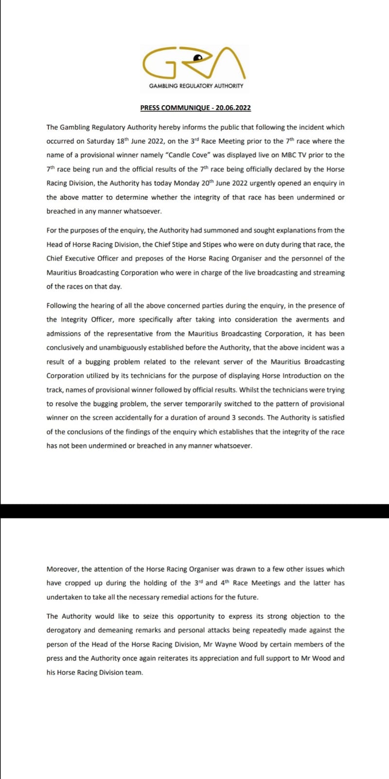 L’enquête initiée par la Gambling Regulatory Authority (GRA) concernant la publication du nom du gagnant de la 7ème course samedi 18 juin avant même le départ, par la Mauritius Broadcasting Corporation (MBC), a conclu à un problème technique. Selon la GRA, un bug lié au serveur de la MBC s’est produit. C’est une situation inédite alors que les chevaux se dirigeaient dans les stalles de départ. C’est ce qui ressort d’un communiqué de la GRA émis ce lundi après-midi, 20 juin.