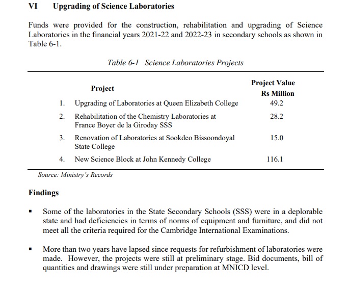 Dans le rapport de l’Audit 2022-2023, publié ce mardi 2 avril, une part importante a été consacrée au ministère de l’Éducation. Le directeur de l’Audit a dénoncé une mauvaise planification au sein du ministère, entraînant des retards dans la livraison des manuels scolaires. L’état déplorable de certains laboratoires dans les écoles secondaires d'État a également été souligné. Le rapport mentionne même des laboratoires ne répondant pas aux normes en matière d'équipement et de mobilier, et ne satisfaisant pas à tous les critères requis pour le Cambridge International Examinations.
