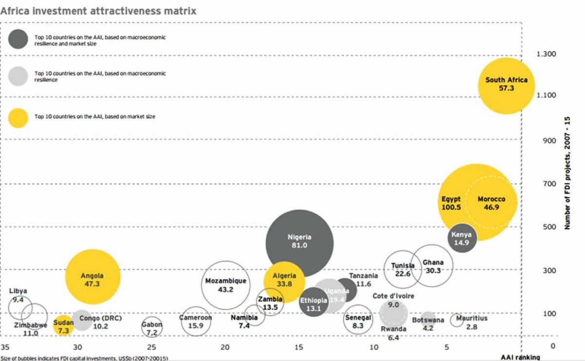 Selon une matrice de l’attrait des investissements en Afrique qui inclut aussi le montant des projets IDE de 2007 à 2015, Maurice se situe au bas de l’échelle avec une note de 2,8 points, précédé par le Botswana (4,2), le Gabon (7,2), le Soudan (7,3), la Namibie (7,4), la République du Congo (10,2). Plus haut, on retrouve l’Egypte (100,5), le Nigéria (81) et l’Afrique du Sud (57,3).