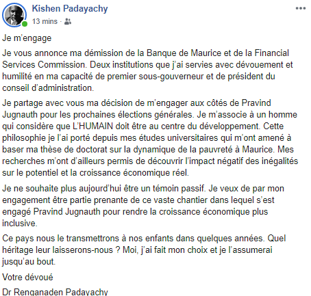 Sur sa page Facebook, Renganaden Padayachy a posté un message d'explications. «Je partage avec vous ma décision de m’engager aux côtés de Pravind Jugnauth pour les prochaines élections générales. Je m’associe avec un homme qui considère que l’humain doit être au centre du développement», écrit-il.