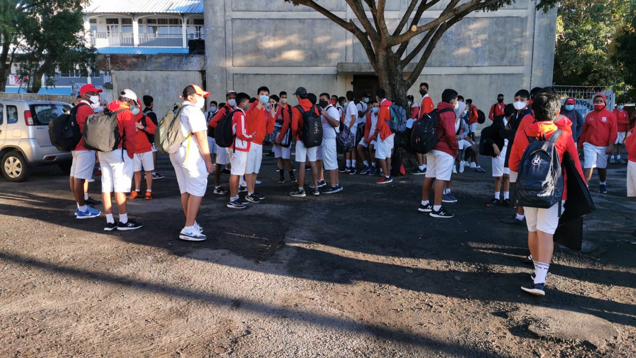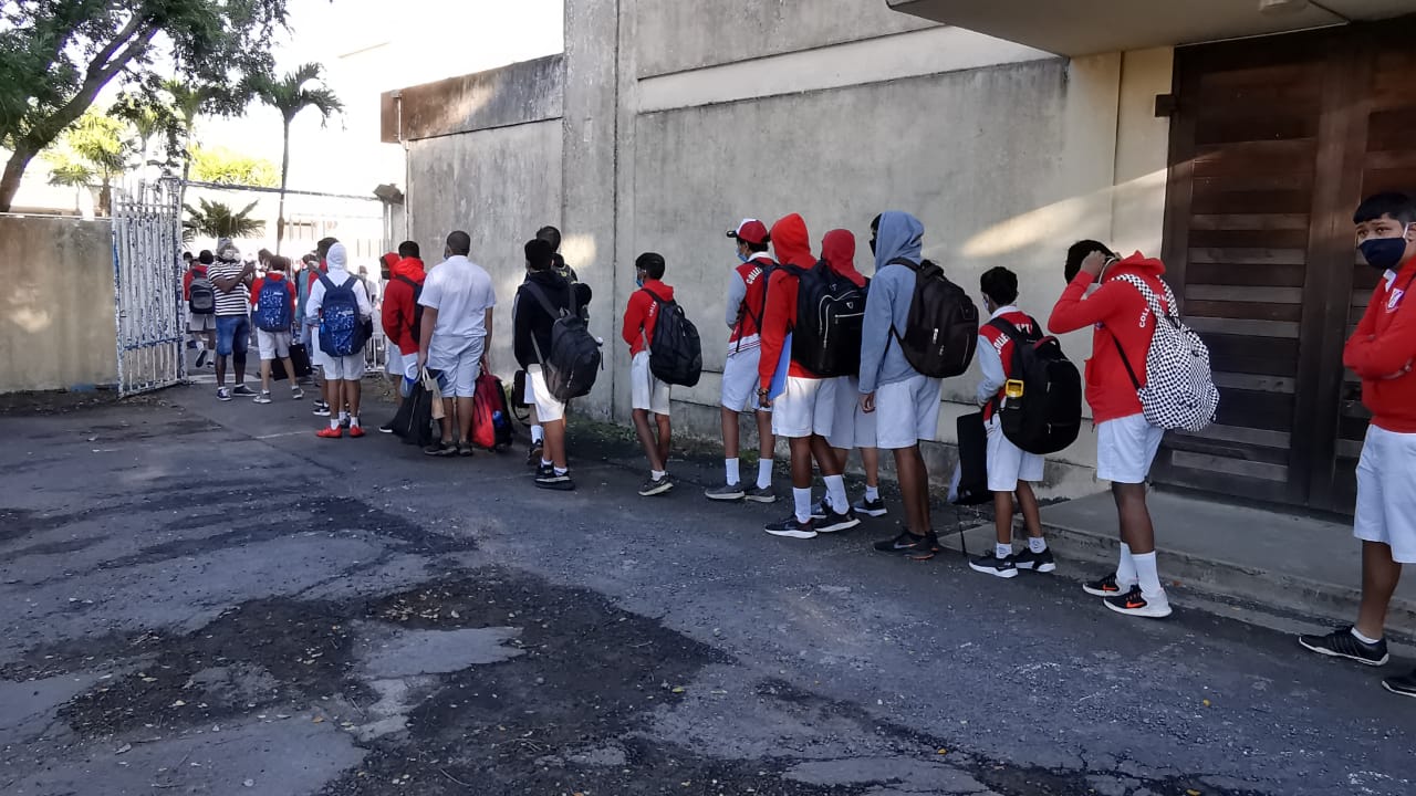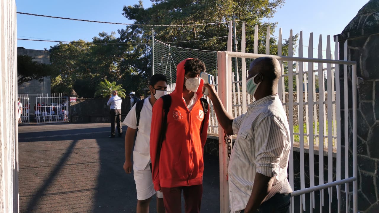 Ce matin nous étions au collège St-Esprit à Quatre-Bornes : prise de température et port du masque sont de rigueur.